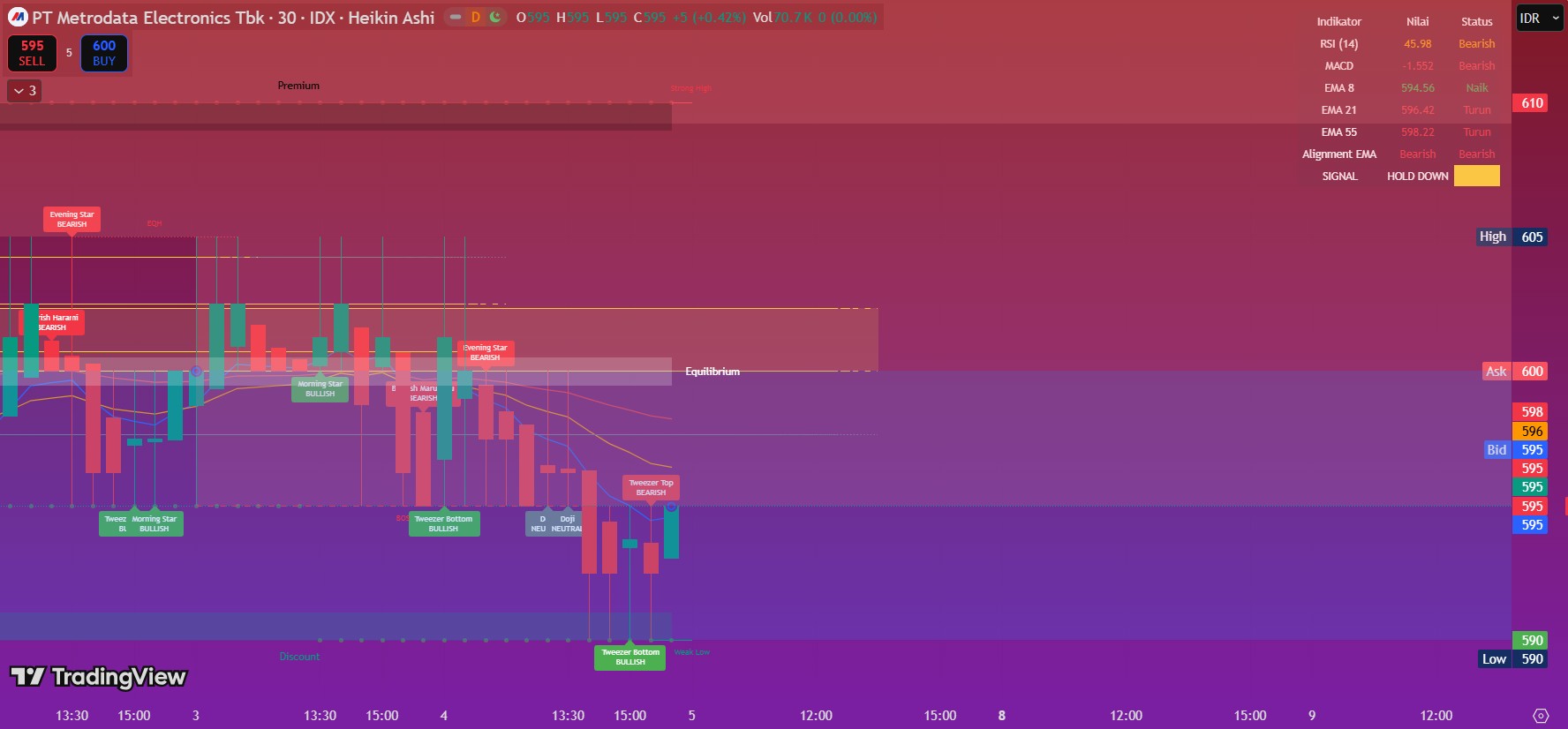 600β605 β Resistance dinamis dari EMA 8 (594.56) dan EMA 21 (596.42) β harga pernah ditolak di sini beberapa kali.