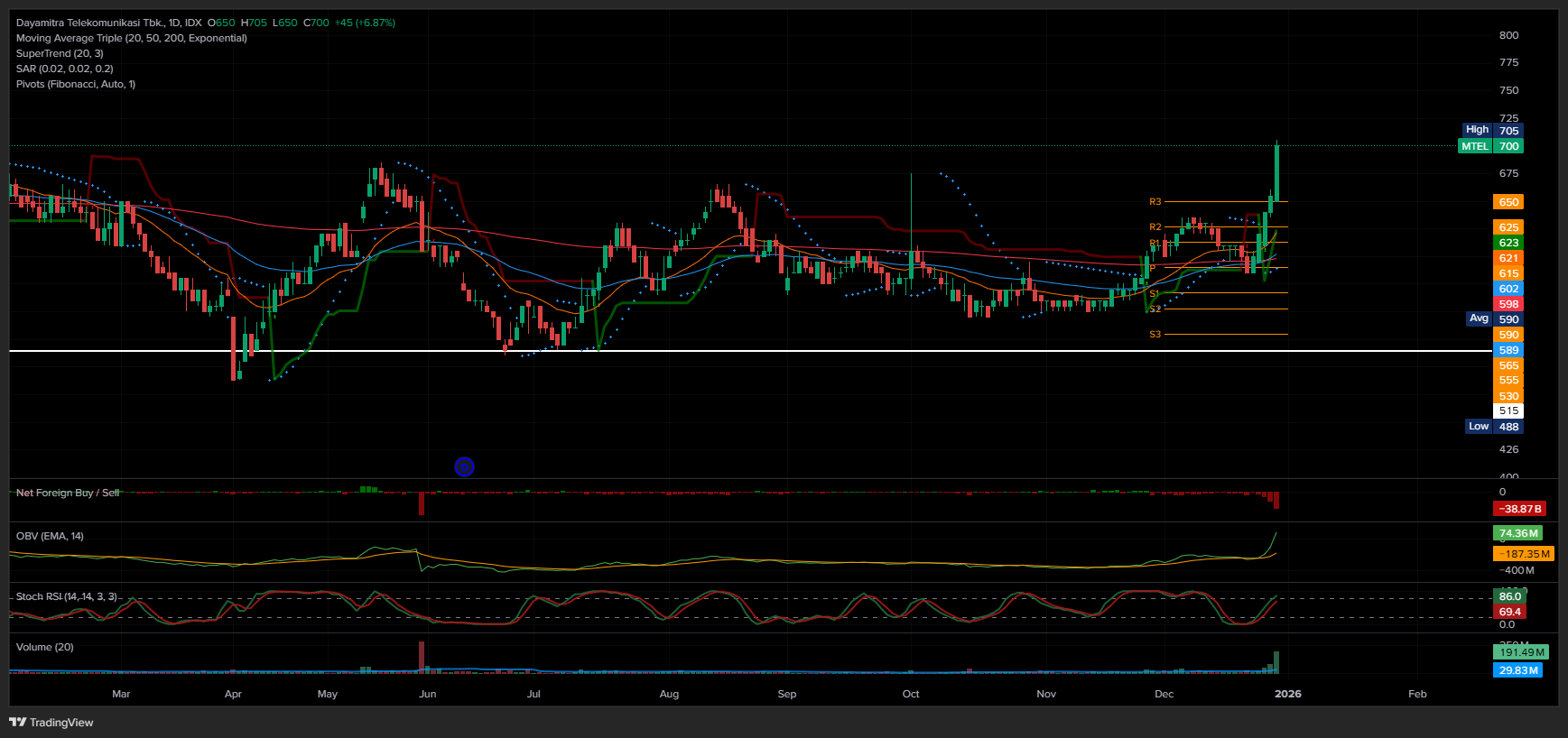 Entry: Buy jika close > 705 dengan volume lanjutan