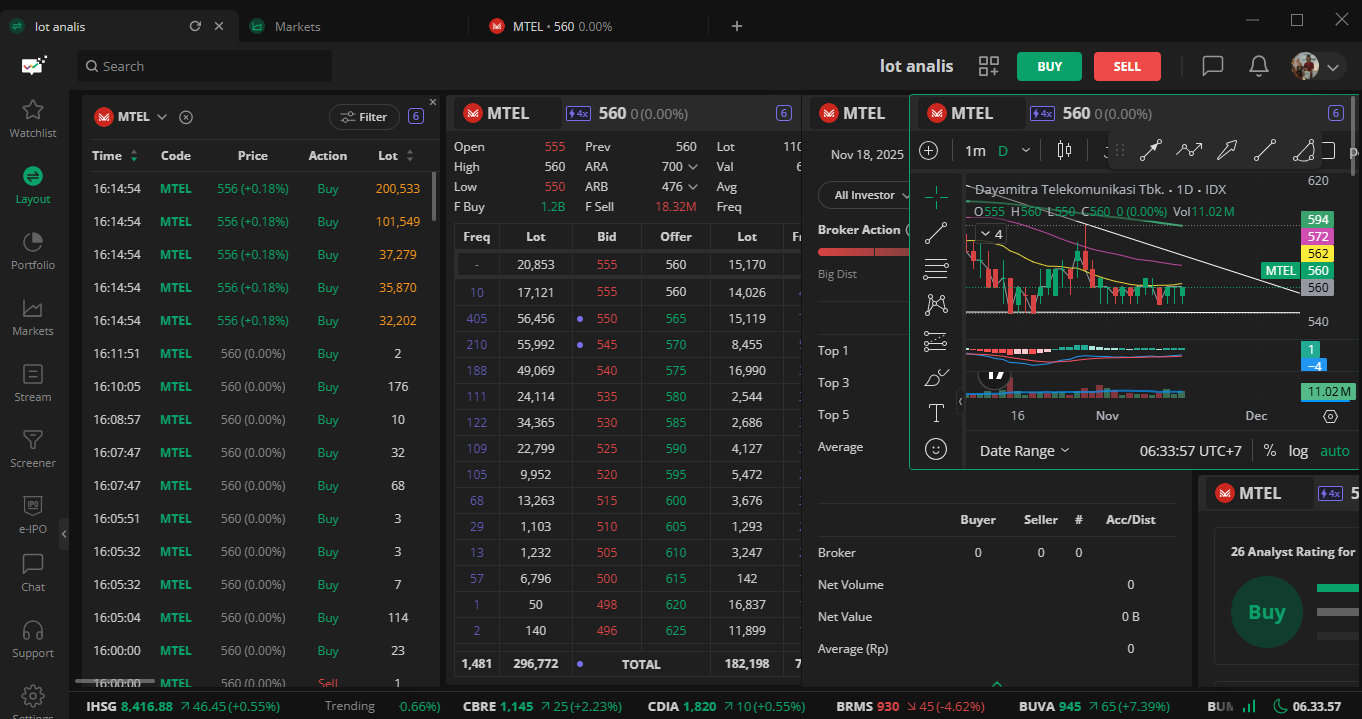 MTEL menunjukkan sinyal bull trap yang berbahaya, di mana kenaikan harga hari ini tidak didukung oleh aliran dana dan justru dilawan dengan distribusi institusional, menciptakan divergensi bearish yang kuat. Meskipun ada sentimen positif jangka panjang dari aksi korporasi, risiko pembalikan arah yang tajam sangat tinggi, sehingga strategi terbaik saat ini adalah menghindari saham ini hingga sinyal aliran dana kembali selaras dengan pergerakan harga.