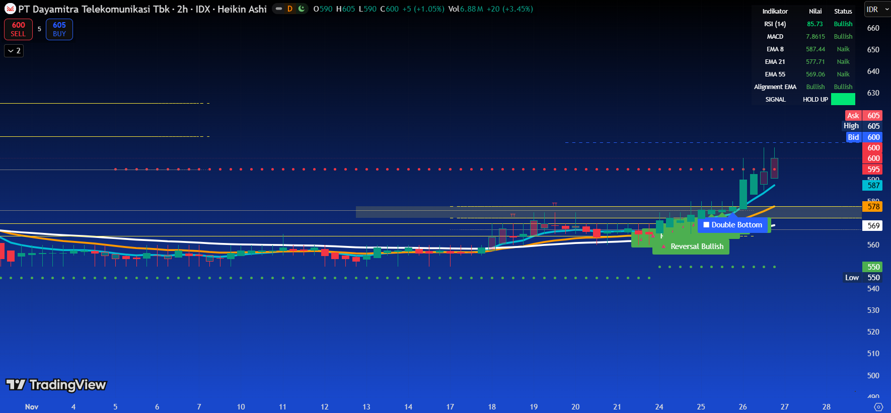 Stop Loss: Di bawah 590 → Support kuat (PDL + EMA 55 konvergen)