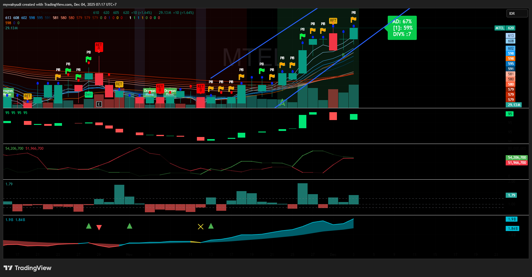 $MTEL update sejak dicall tanggal 26 november 2025 terhitung 1 minggu , mtel berhasil naik sebesar 3.3 % .. berarti ini masih on the track arah 700 , selama 1 minggu ini dominan buyer diikuti power diatas 80% terlihat dr gold flag dan blue dot..