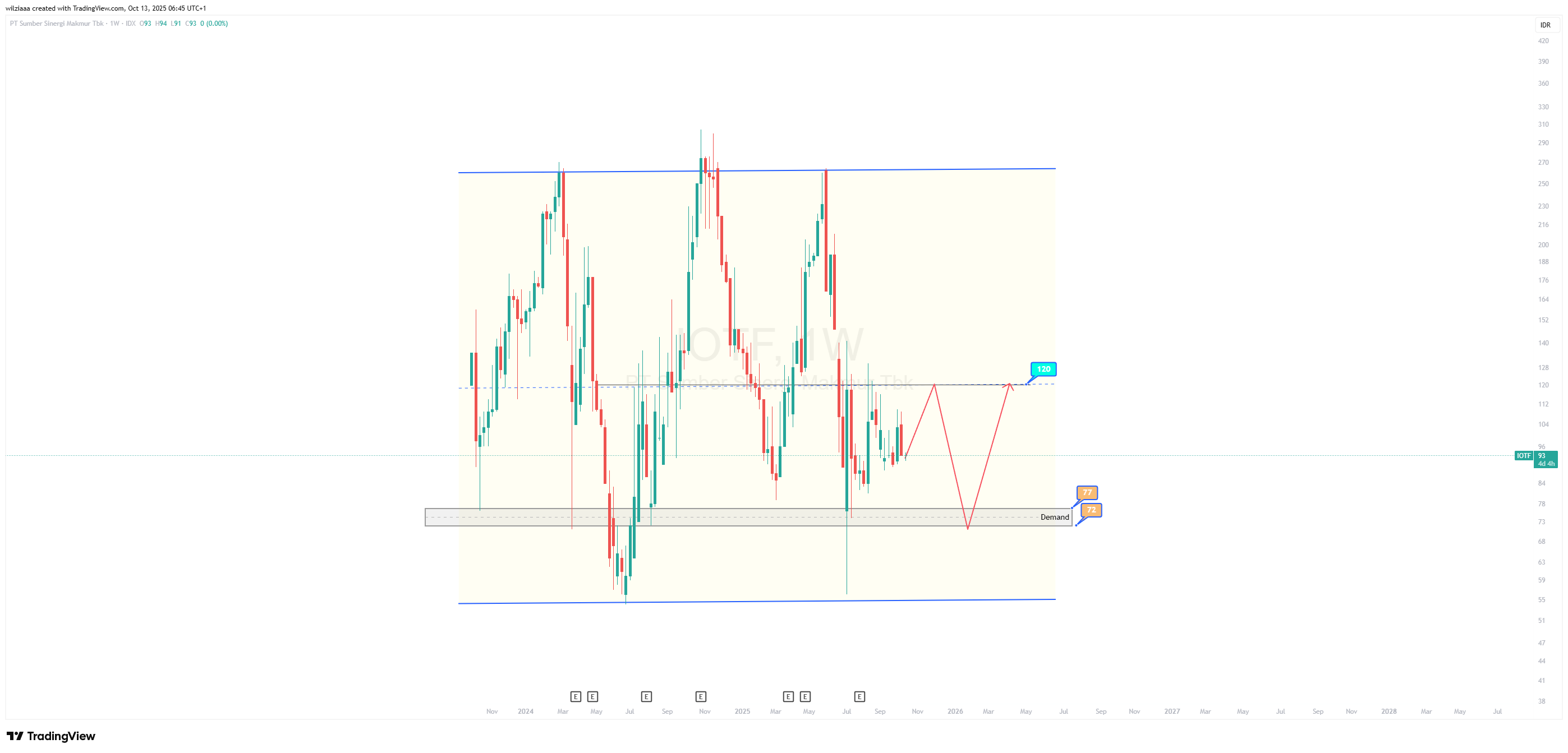 Selama harga mampu bertahan di atas area demand 72–77, potensi untuk technical rebound menuju resistance 120 tetap ada.