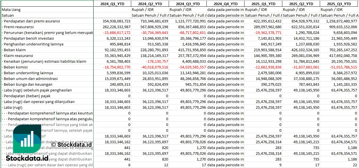 •Combined ratio: 9M ~73,0% (naik dari 6M ~69,4%), masih <100% (profit underwriting), namun memburuk QoQ karena tekanan klaim. (Total beban underwriting 9M Rp 262,1 miliar; 6M Rp 162,1 miliar).