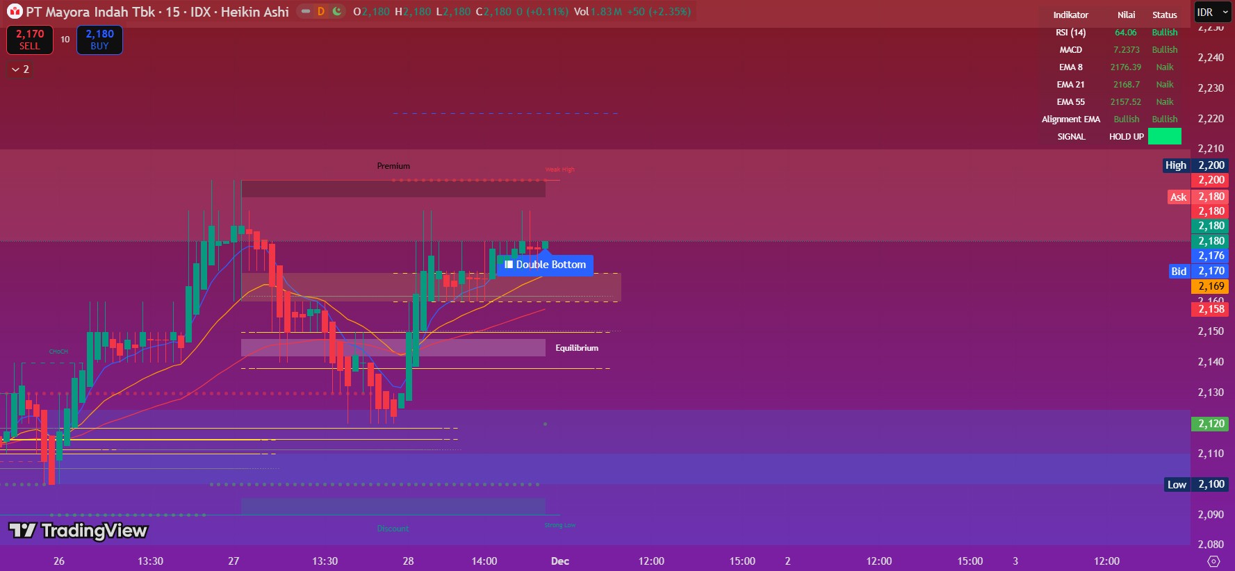 β Jika harga gagal tembus dan turun dari 2,180 β bisa koreksi ke 2,140β2,120 (EMA 21 sebagai support).