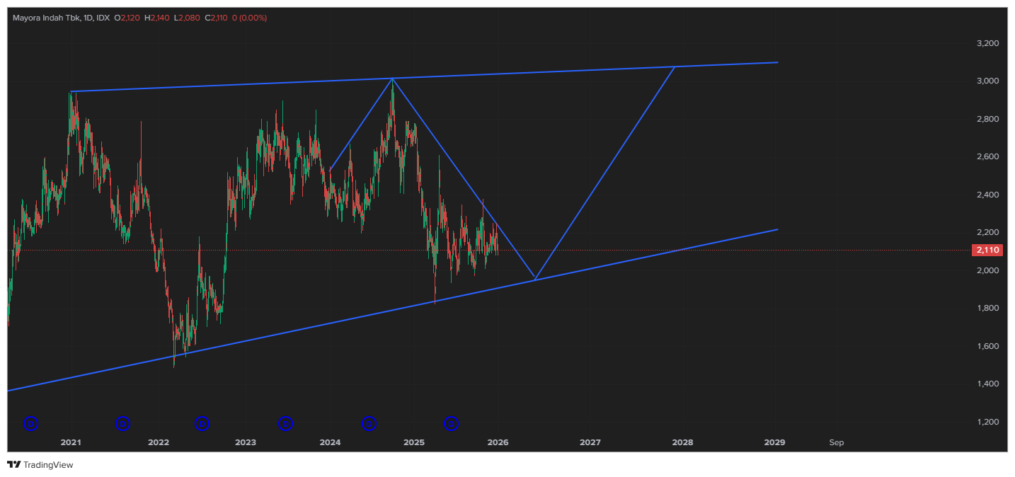 Selama harga bertahan di atas support channel, tren jangka panjang MYOR masih valid naik.