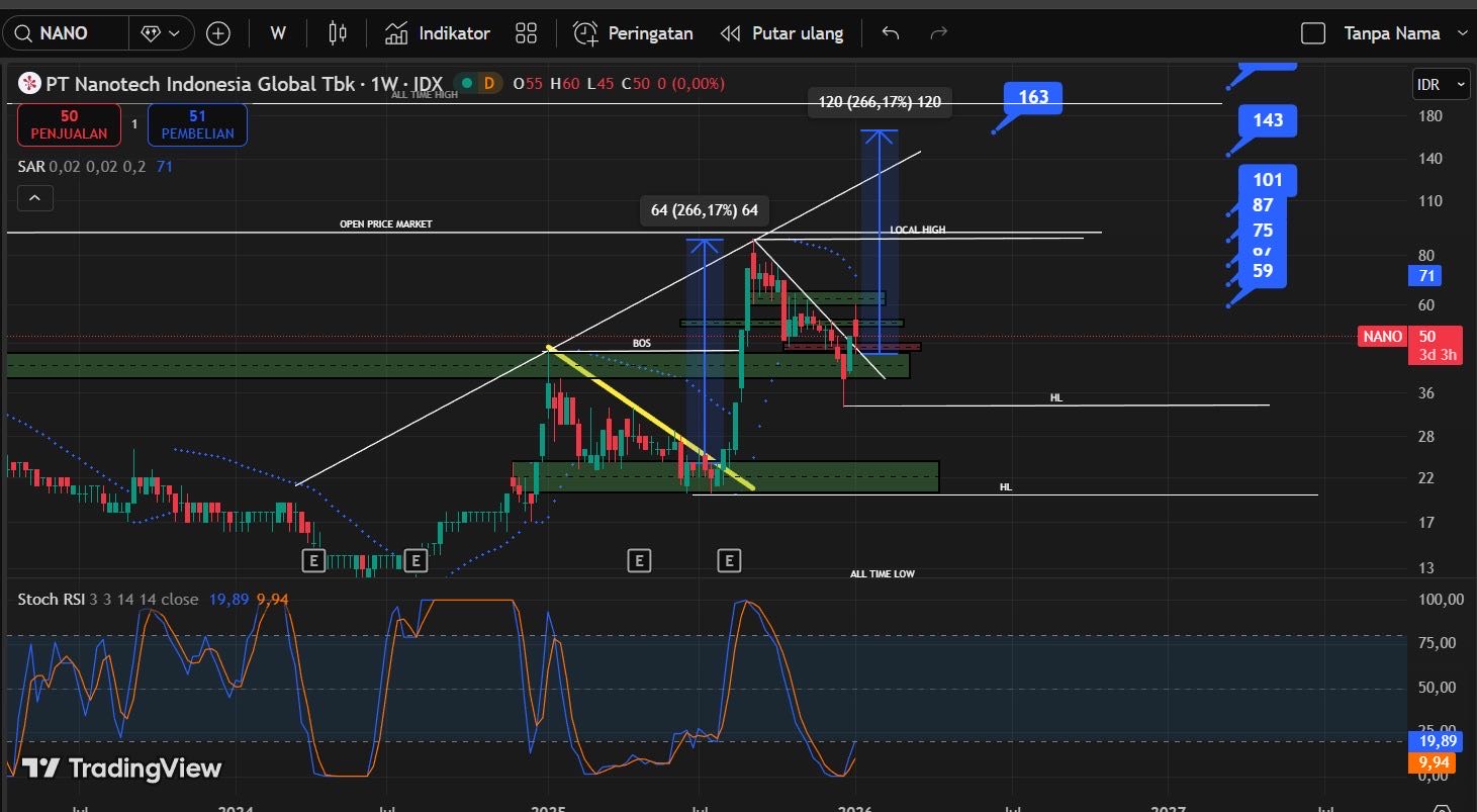 Kondisi saham $NANO saat ini ibarat sebuah perahu kecil yang sedang bersandar di bibir jurang air terjun (level Rp 50). Meskipun ada ombak kecil yang bisa membuatnya sedikit terangkat ke atas, mesin perahu tersebut (arus kas dan laba) sedang lemah, sehingga risiko untuk terseret jatuh ke bawah jauh lebih besar daripada kemampuan perahu untuk melaju melawan arus menuju ke tengah laut yang aman.