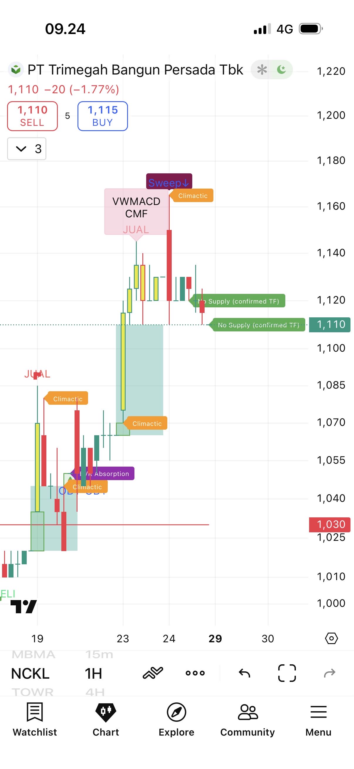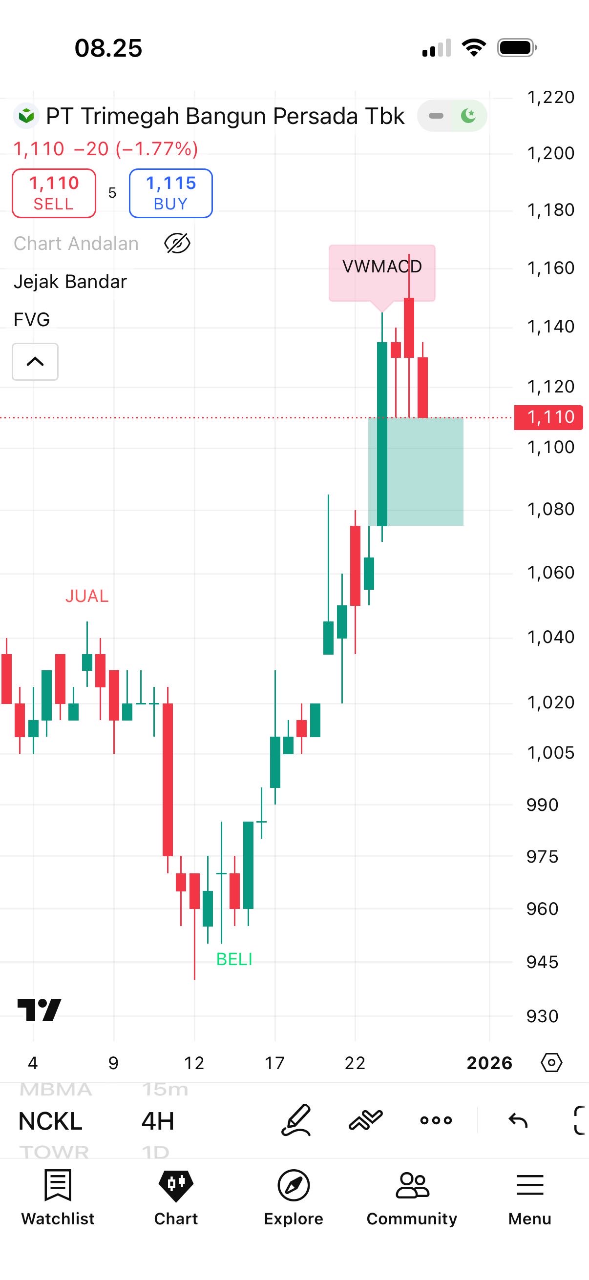 ini chart $NCKL yang 1 jam..harga memantul setelah menyentuh FVG. Konfirmasi satu candle lagi, kalau hijau juga, bisa masuk
