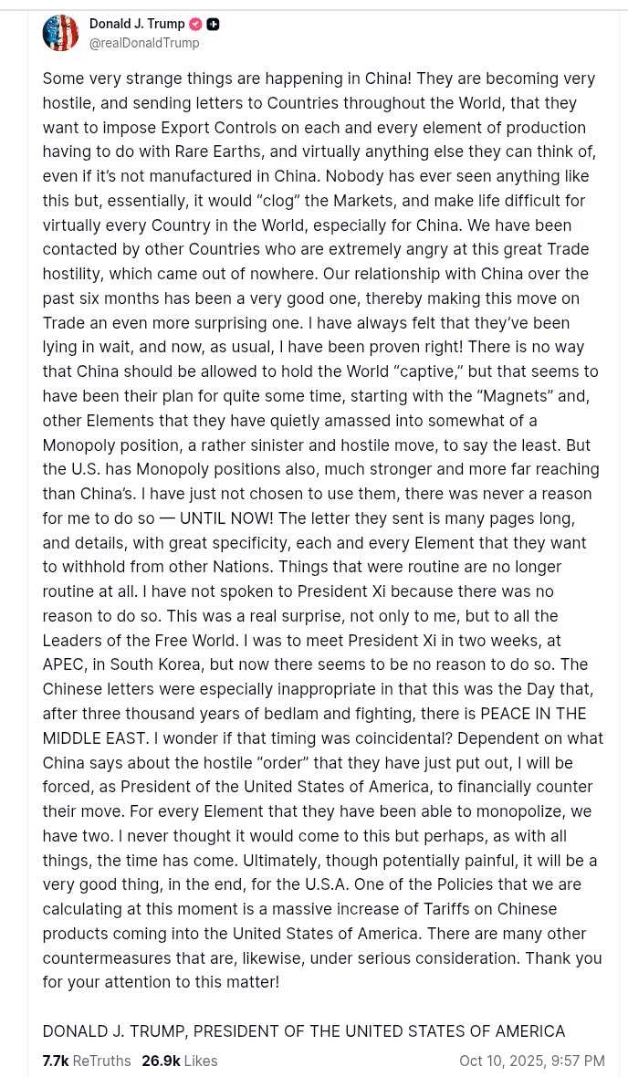 ➖ Trump kecewa dengan langkah China yang makin memperketat ekspor rare earths.