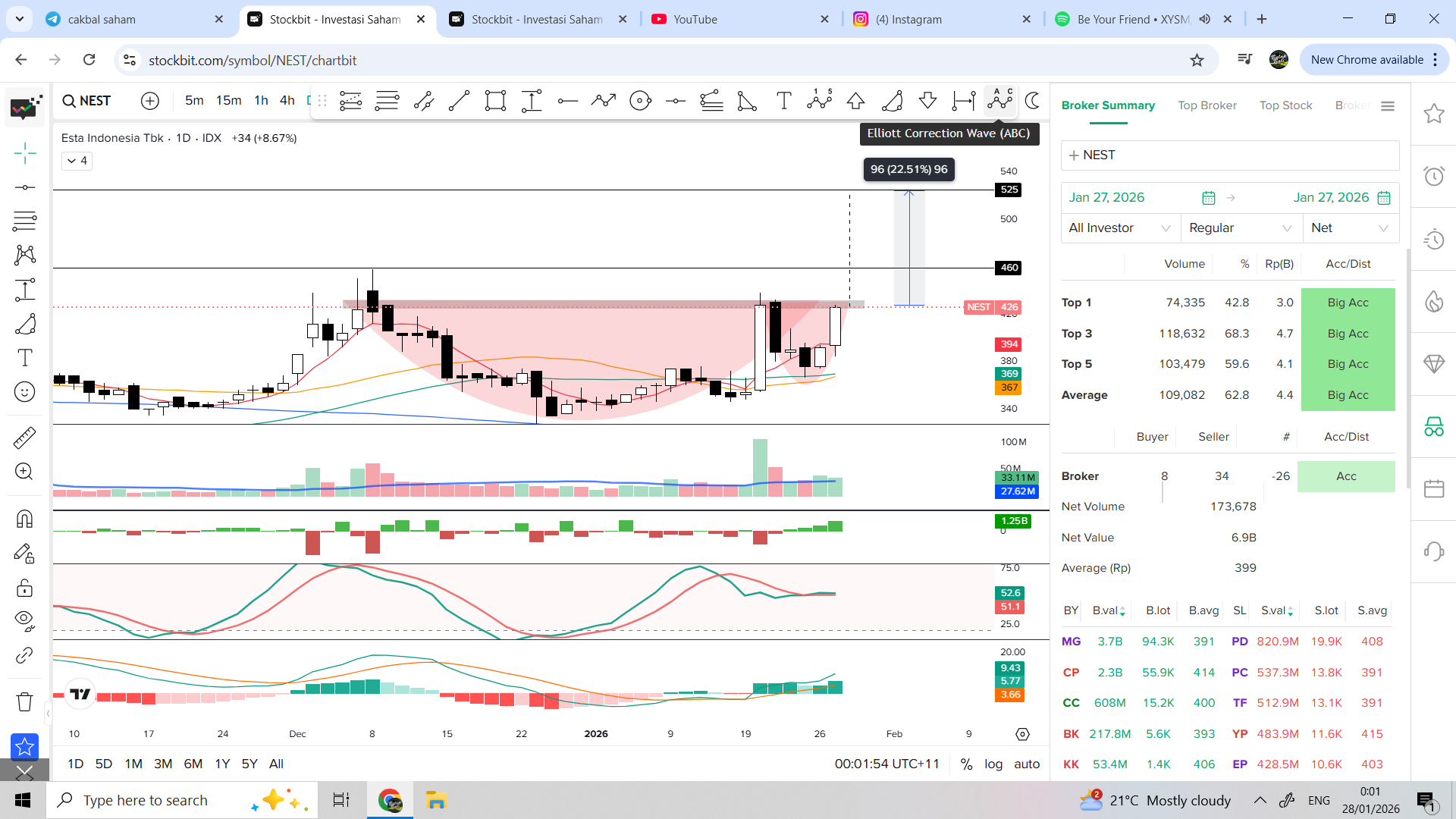 Secara teknikal terlihat membentuk cup and handle dengan harga 438-428 sebagai area neckline. Kenapa saya terus cari metode chart pattern? Karena ini metode yang cocok buat saya, kalo kalian merasa tidak cocok silahkan cari metode trading sendiri. Anyway, secara broker summary juga menarik terlihat broker MG, BK akum hari ini diharga rata-rata 391-393. Indikator Stochasitc & MACD juga menandakan sinyal buy.