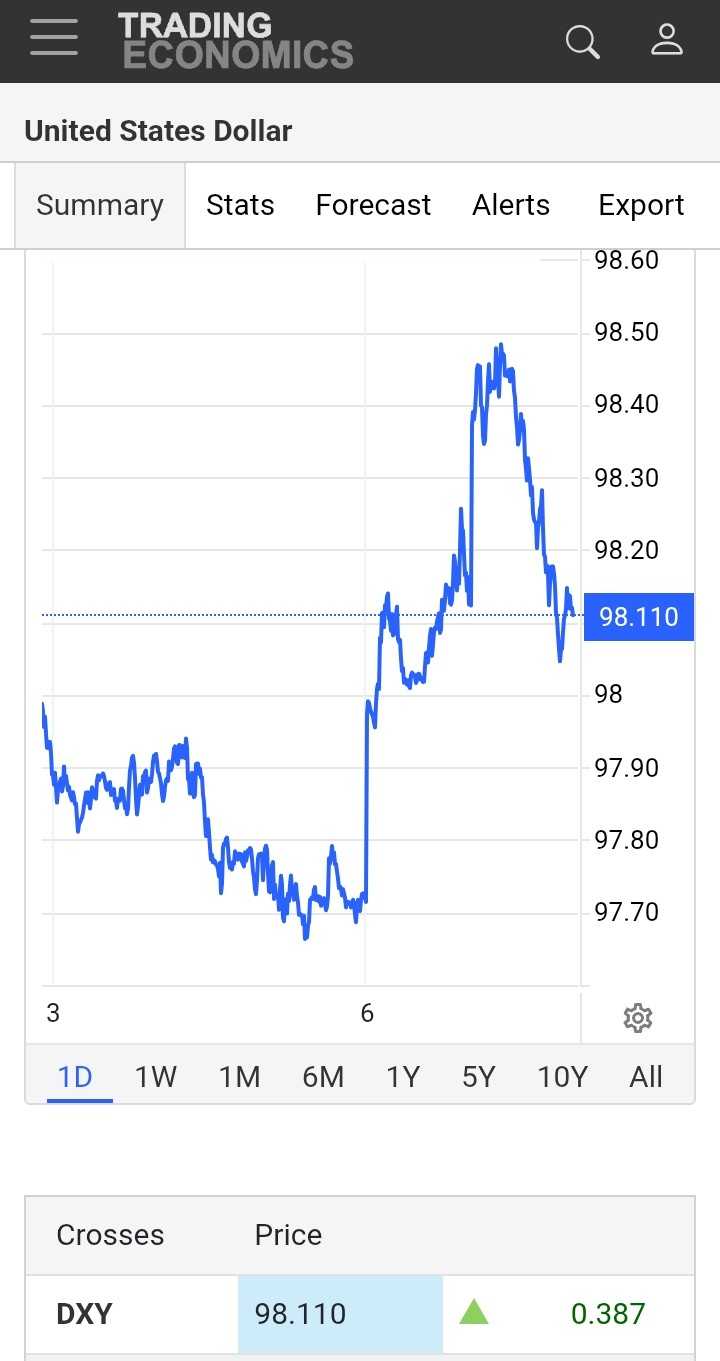 ➖ US Dollar Index DXY sempat naik menyentuh 98,5 pagi tadi, dari akhir pekan lalu yang masih di bawah 98.