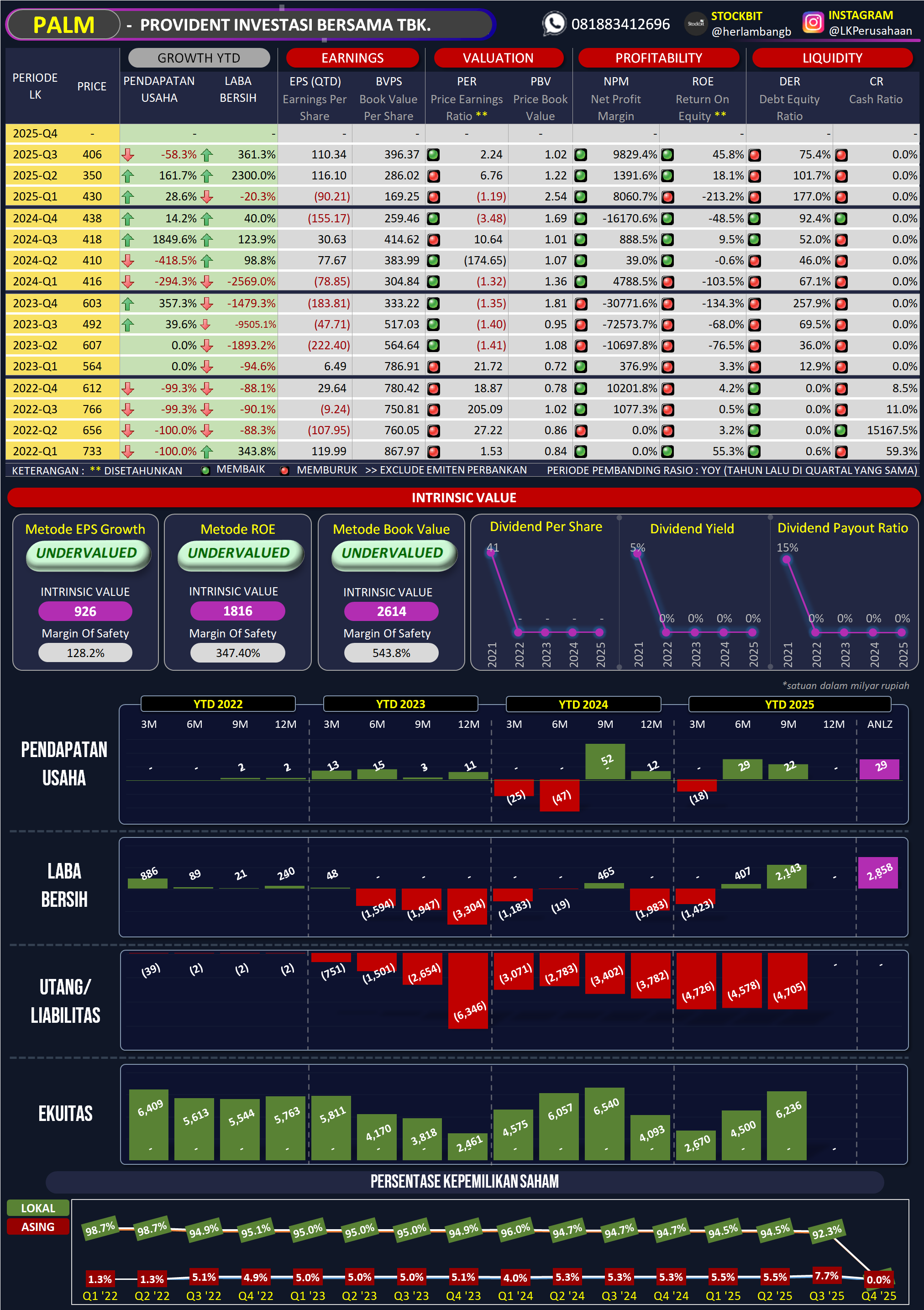 Jadi kesimpulannya PALM itu saham yang harus dibaca kayak fund, bukan kayak emiten pabrik/ritel. Yang lo analisa bukan revenue & margin, tapi fair value changes, disposal timing, cash conversion, dan komposisi portofolio. High gain? Iya. High risk? Juga iya, karena kalau portofolio merah bottom line langsung kebalik.