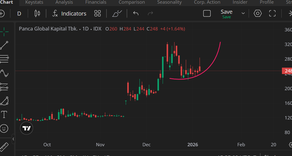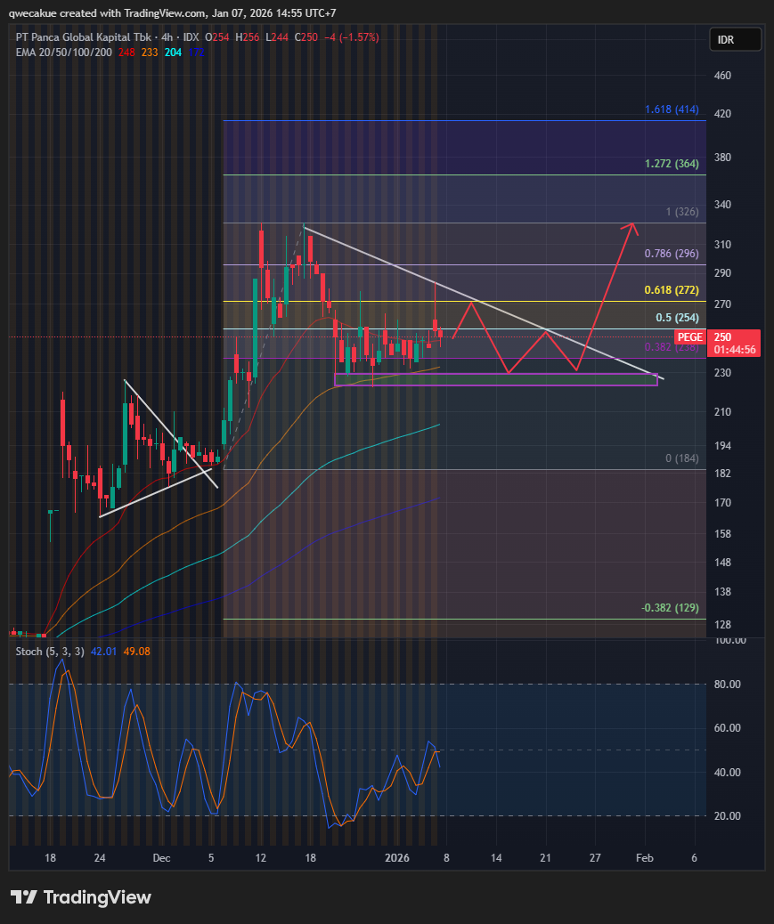 Reasoning: PEGE mengalami rally explosive +137% dari 130 → 308 dalam November-Desember 2025, driven by spekulasi Rights Issue Jilid II + turnaround profitabilitas. Current price 248 turun -19.5% dari peak 308, mengindikasikan healthy profit-taking correction.