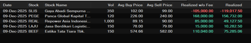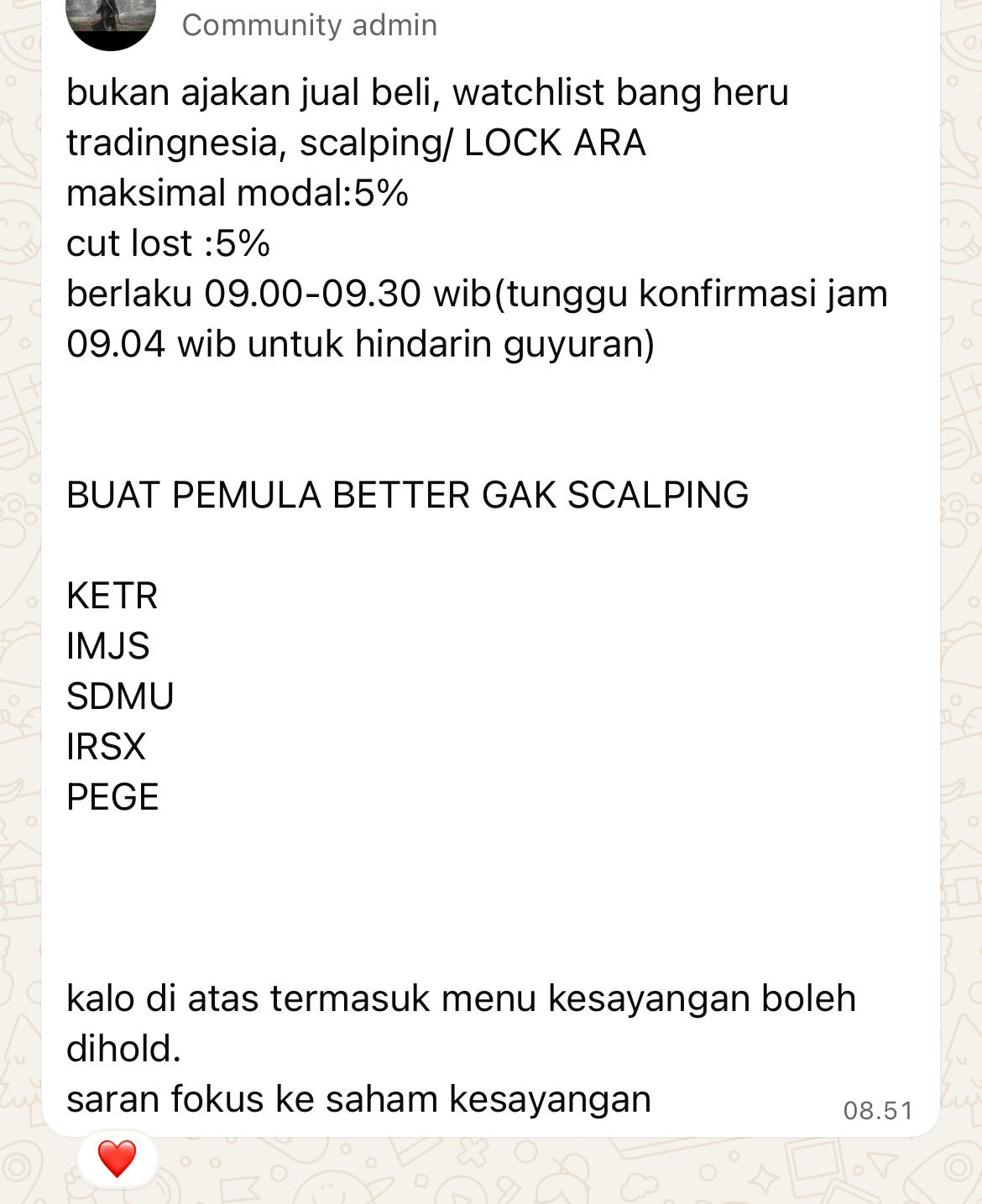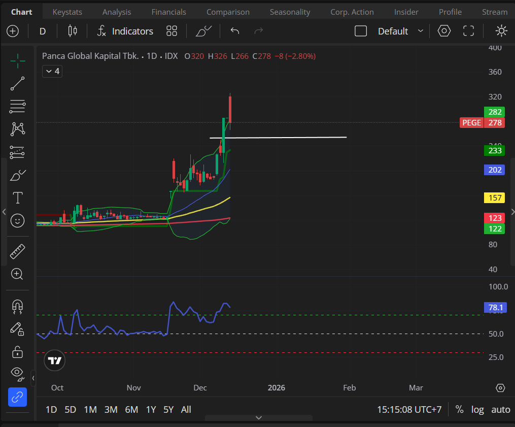 ​Implikasi: Ini mengonfirmasi sinyal profit taking (aksi ambil untung) atau koreksi wajar yang telah diindikasikan oleh wick (sumbu) atas pada lilin tertinggi (sehari sebelumnya). Kenaikan tajam yang didorong oleh sentimen rights issue sedang mengalami pendinginan.