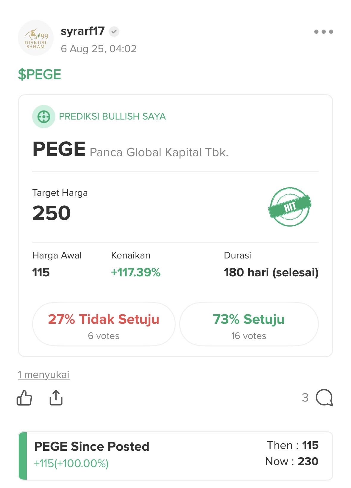 $PEGE Sengaja tidak di kasih naik karna kalo naik lagi pasti suspend yang ke 3 kli nya di Saham itu harus ada yang nama nya koreksi