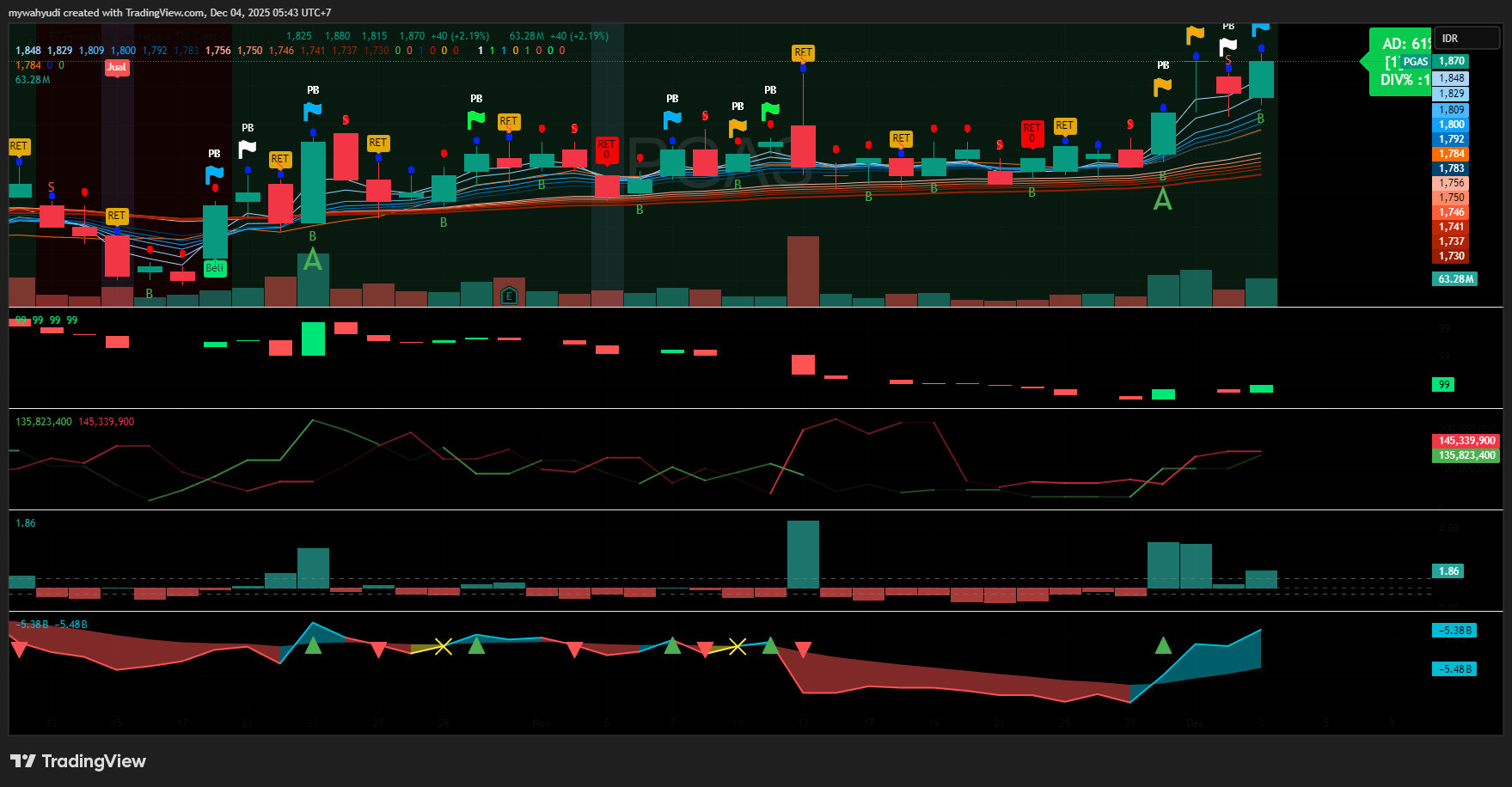 $PGAS update data teknis 1.uptrend ( ma slow > ma fast ) 2. 6 hari buyer dominan (blue dot ) 3. konfirm A ( H+4) 4. setelah koreksi signal s ( harga masih di jagain di ma 2 nya ) walau signal s teteapi masih buyer yang dominan 5. div nya 12 % 6. vpa nya udah mulai bertingkat 7. 4 hari agresif power buynya setiap candle disertai flag power buy.. mulai dari 60 % keatas.. kesimpulannya : on the track ke 1950 terdekatnya