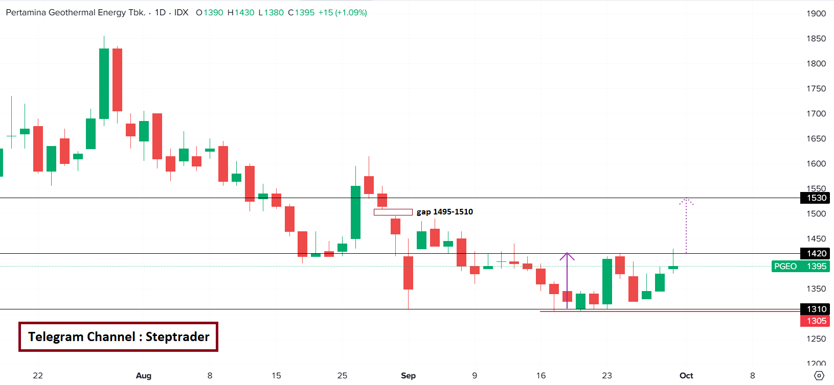 πΉ $PGEO rebound dari support 1305/1310 dan saat ini naik uji resistance level 1420.
