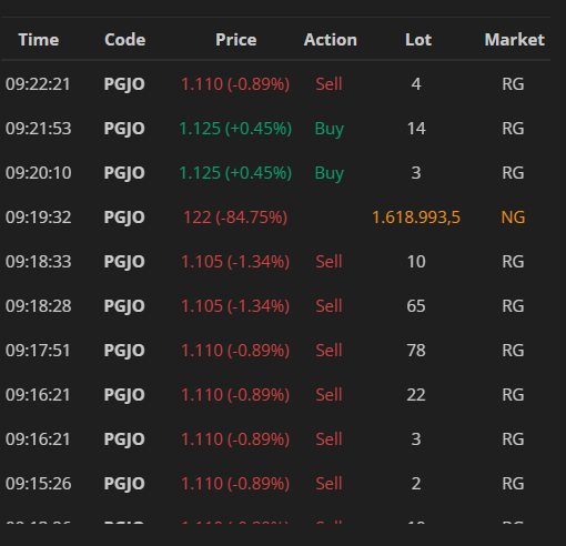 @ilzamzuhdi Kalo itu transaksi TO, orang gila mana yg mau barangnya dijual ke emiten harga segitu, sedangkan di reguler harganya masih 1k š¤ $PGJO
