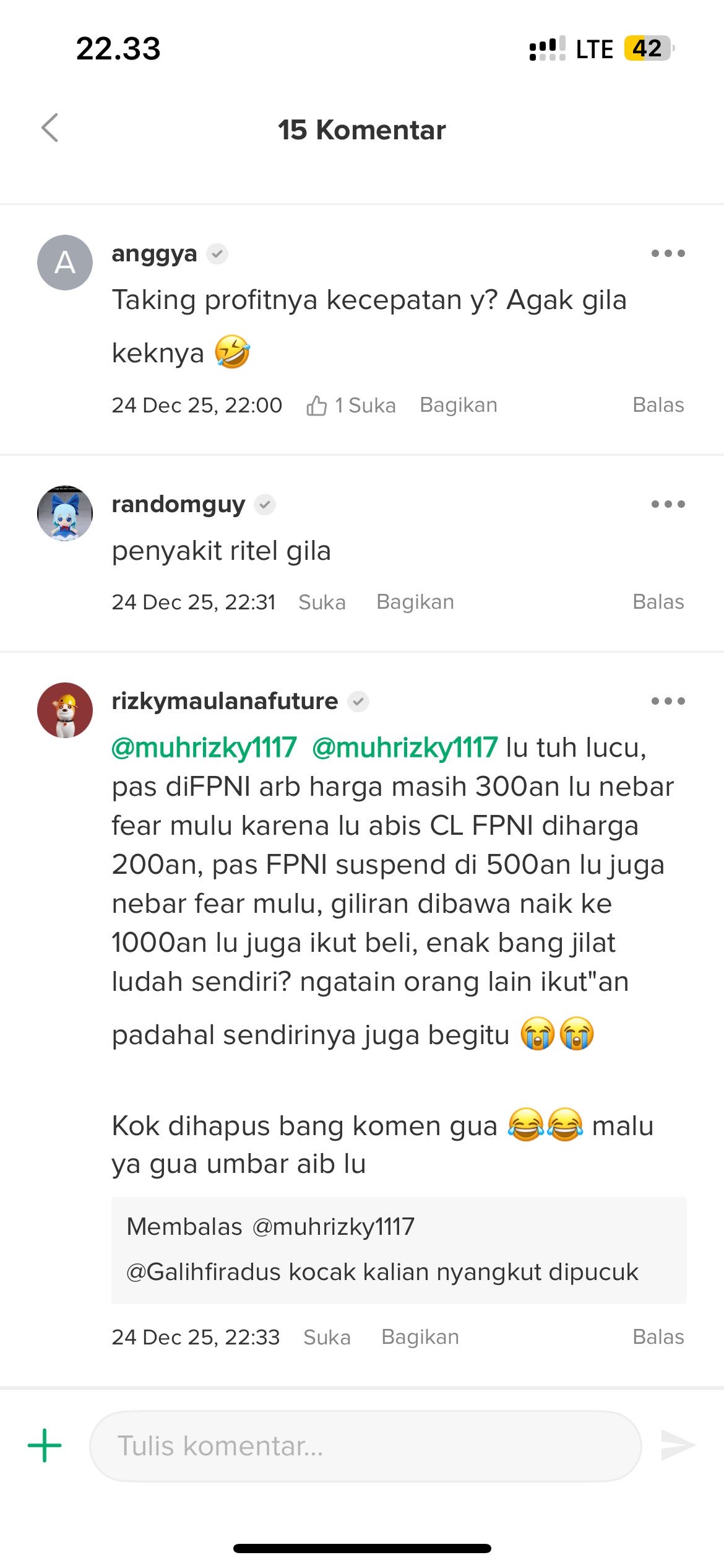 @furishidiqi ngamuk ga terima om? baru masuk di sirkel nopek kah? gua udh lama tau dr awal pipa lapd $MEJA naik dulu..saat $PIPA $LAPD naik noh liat banyak sangkuter maksud gua klw saham udh tinggi gausah lah dikejar ...nyangkut ritel tolol malah nyalahin emiten nyalahin orang..baca stream pipa dan lapd hari ini sampe 3 bulan yang lalu