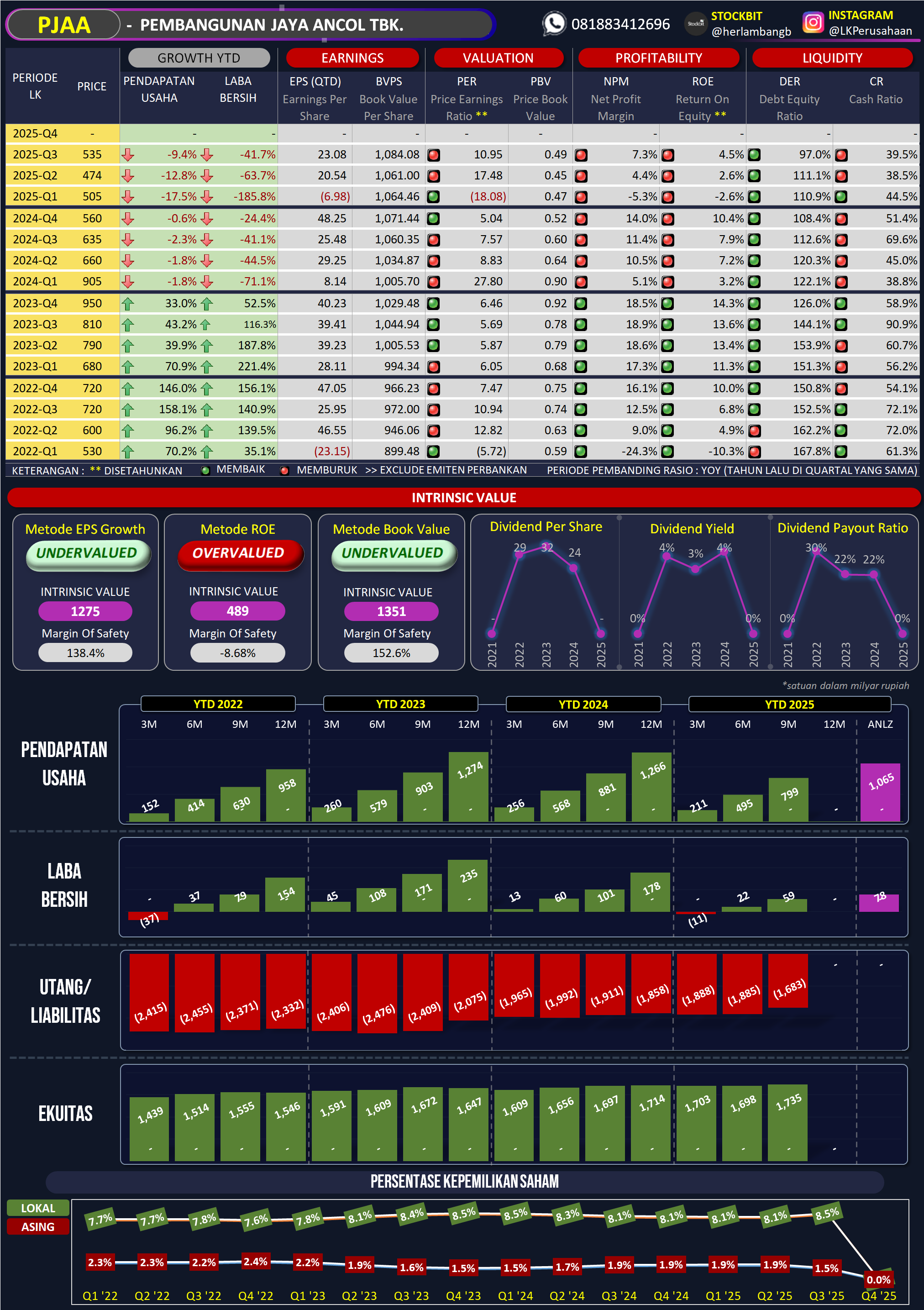 Berikut bedah Q3 2025 untuk $PJAA (PT Pembangunan Jaya Ancol Tbk.): ringkasan angka utama, valuasi, solvability, efektivitas manajemen, cerita bisnis / katalis, serta riwayat GCG.