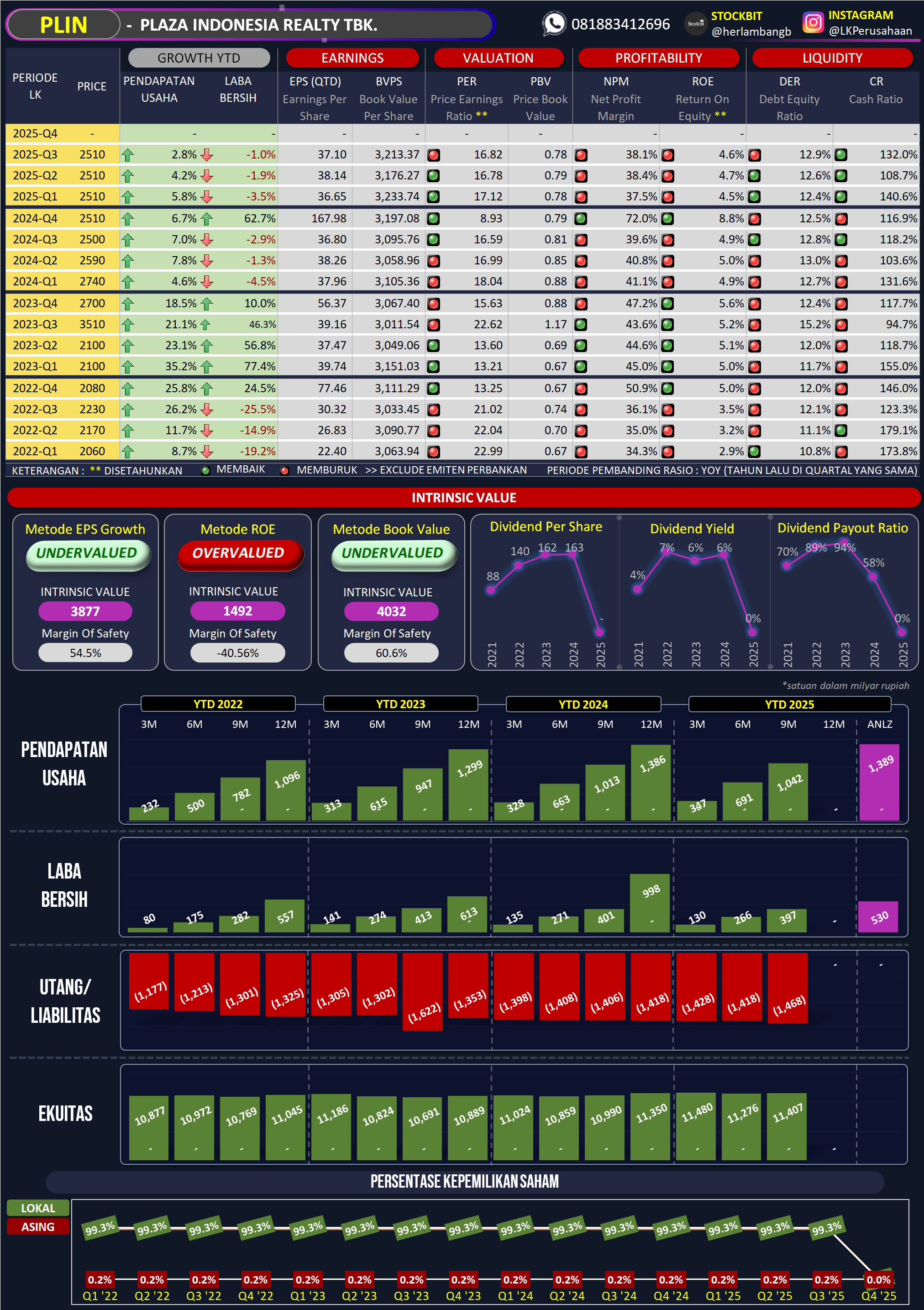 Per 30 Juni 2025, PLIN membukukan laba bersih Rp265,5 miliar, dengan saldo laba ditahan tidak dibatasi sebesar Rp10,13 triliun dan total ekuitas Rp11,28 triliun.