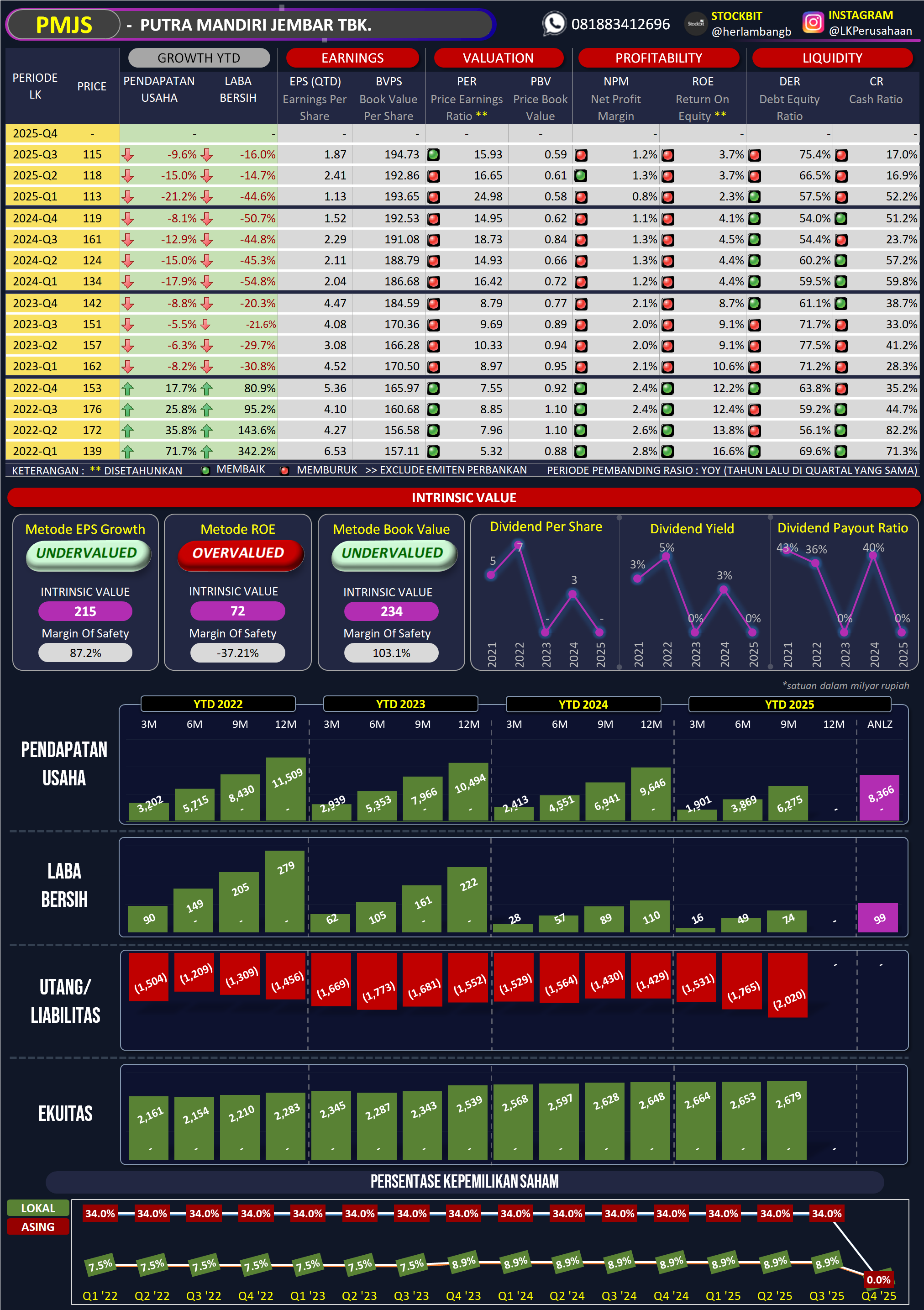 Secara valuasi, harga saham PMJS di 118 Rupiah tampak murah dari sisi nilai buku dengan PBV 0,61 kali, tapi dari sisi laba, PE 16,32 kali masih tergolong mahal untuk ukuran perusahaan dengan ROE hanya 3,7% dan CFO negatif. Investor yang mengandalkan potensi aset riil mungkin melihat PMJS sebagai saham undervalued, tetapi secara fundamental arus kasnya menunjukkan risiko likuiditas serius. Nilai buku yang kuat memang memberi margin of safety, namun tanpa konversi persediaan menjadi kas, angka di neraca hanya sebatas kertas.Upgrade skill https://cutt.ly/Ve3nZHZf
