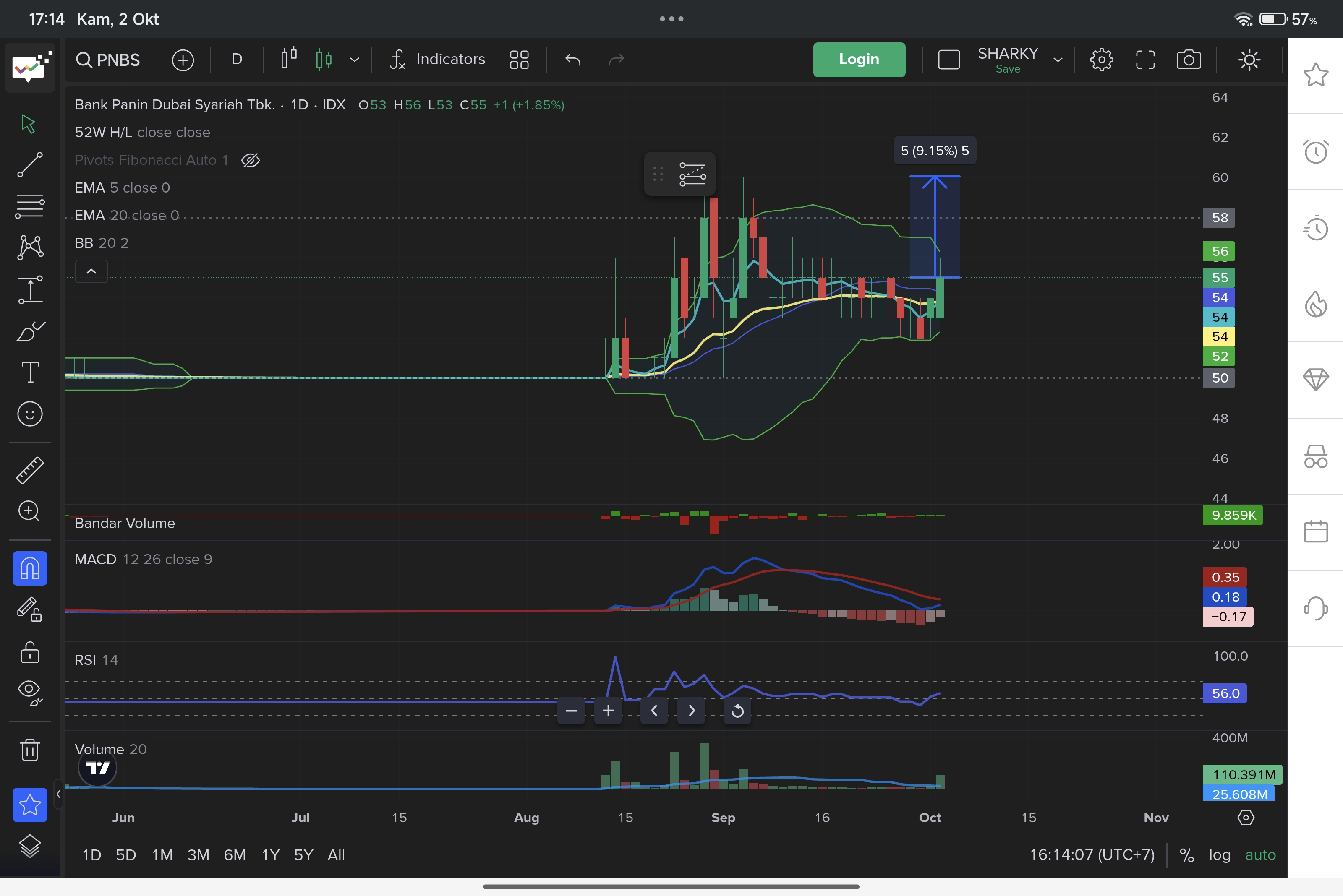 🔎 Stochastic Slow di 91,88 (sangat overbought), CCI di 144,92 (tinggi), Volume 5.209K (-8,18%) → volume turun saat koreksi minor.