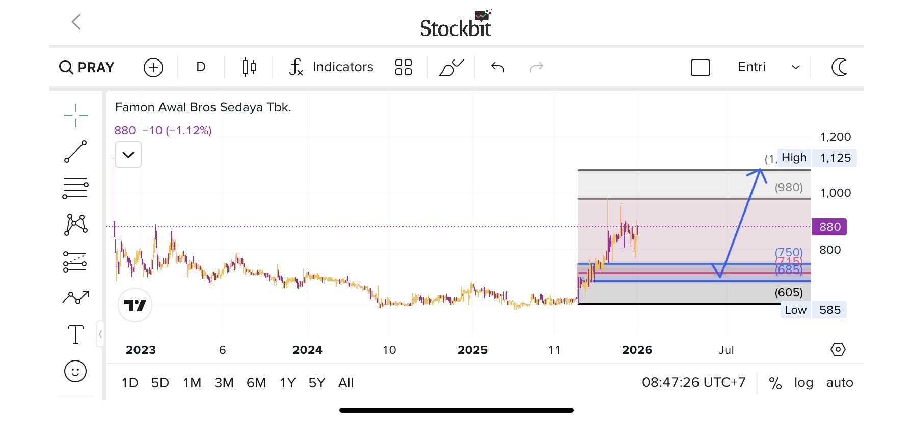 Buy on Support: 710 – 735 (Area akumulasi spekulatif dekat titik terendah Desember).