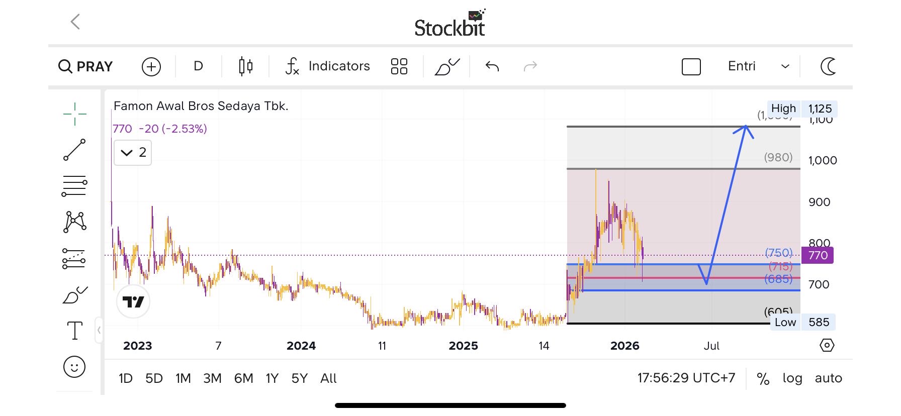 Buy on Rebound: > 760 (Valid jika harga mampu menembus resisten minor harian dengan volume beli yang menebal).