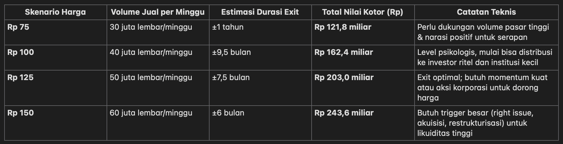 Jika harga saham bisa naik ke Rp 100, distribusi menjadi lebih cepat. Menjual 40 juta lembar per minggu akan memakan waktu sekitar 41 minggu atau sekitar 9–10 bulan, dengan nilai kotor mencapai Rp 162,4 miliar. Level ini dianggap paling realistis untuk melakukan exit tanpa menciptakan tekanan jual berlebih di pasar.