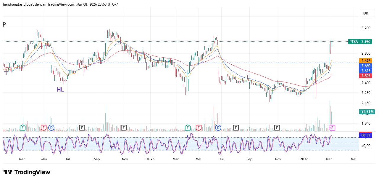 • Penjelasan: Naik +0.34% ke 2980, chart flat-up (52w: 2170-3070). Volume besar, foreign interest tinggi. Scalp cepat di range 2910-3010, jika breakout 3000, tambah posisi. One trade: Buy hold jika tren coal positif.