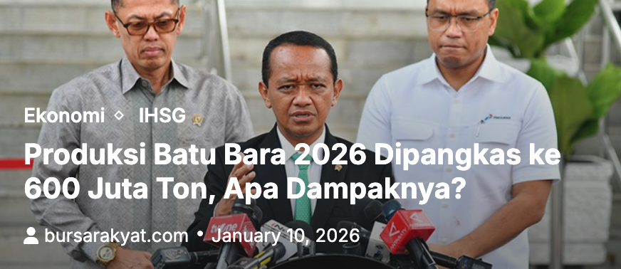 Menteri Energi dan Sumber Daya Mineral (ESDM) akan memangkas produksi batu bara Indonesia pada tahun 2026 menjadi sekitar 600 juta ton. Jika kita bandingkan dengan total produksi batu bara Indonesia tahun 2025 itu mencapai 790 juta ton.