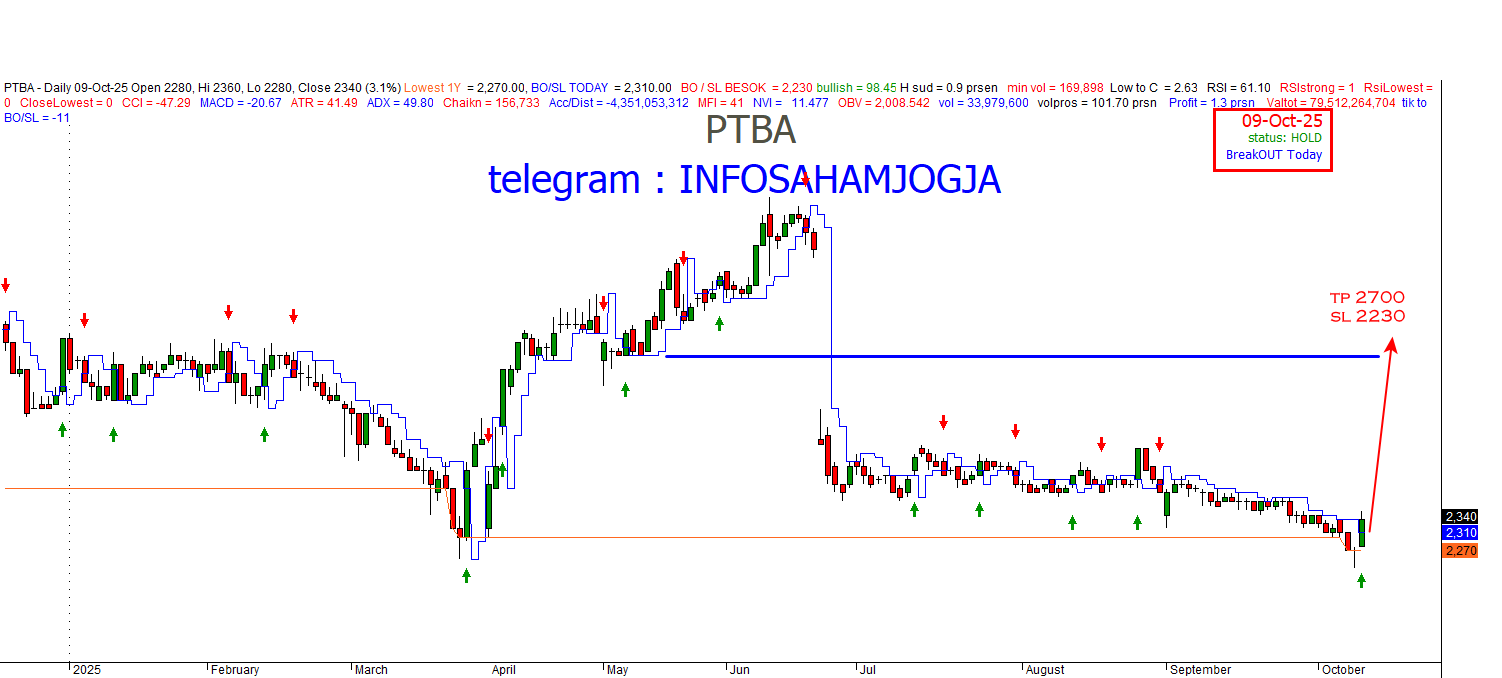 $PTBA dari TA sudah ada signal buy, semoga uptrend. BreakOut terjadi, disertai High Volume juga saat Kqmis 9 Okt.