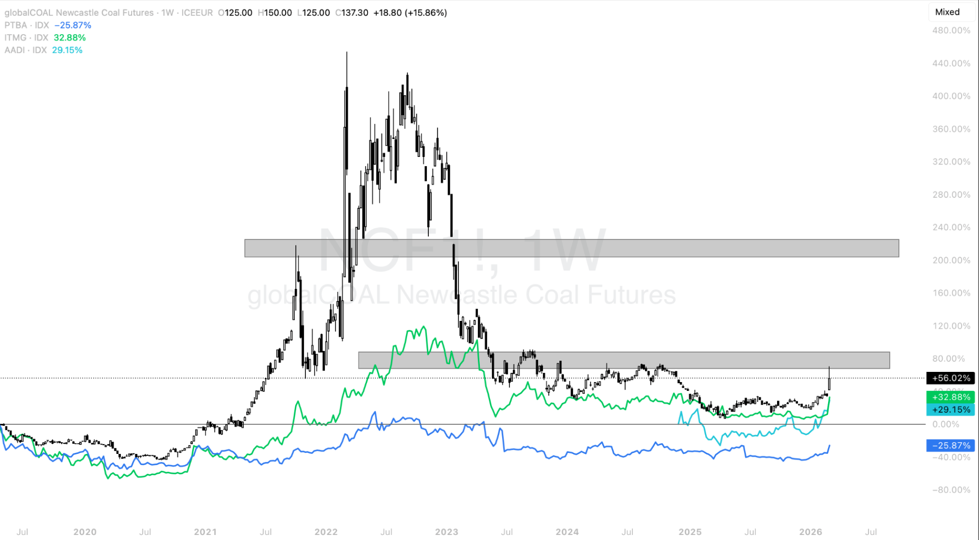 Data historis ini menunjukkan bahwa ketika harga batu bara kembali bergerak menuju level yang sama seperti pada siklus sebelumnya, saham-saham sektor coal berpotensi mengalami kenaikan lanjutan mengikuti momentum komoditasnya. Namun demikian, realisasi kenaikan tersebut tetap dipengaruhi oleh kondisi pasar global, permintaan energi, serta sentimen investor terhadap sektor komoditas.