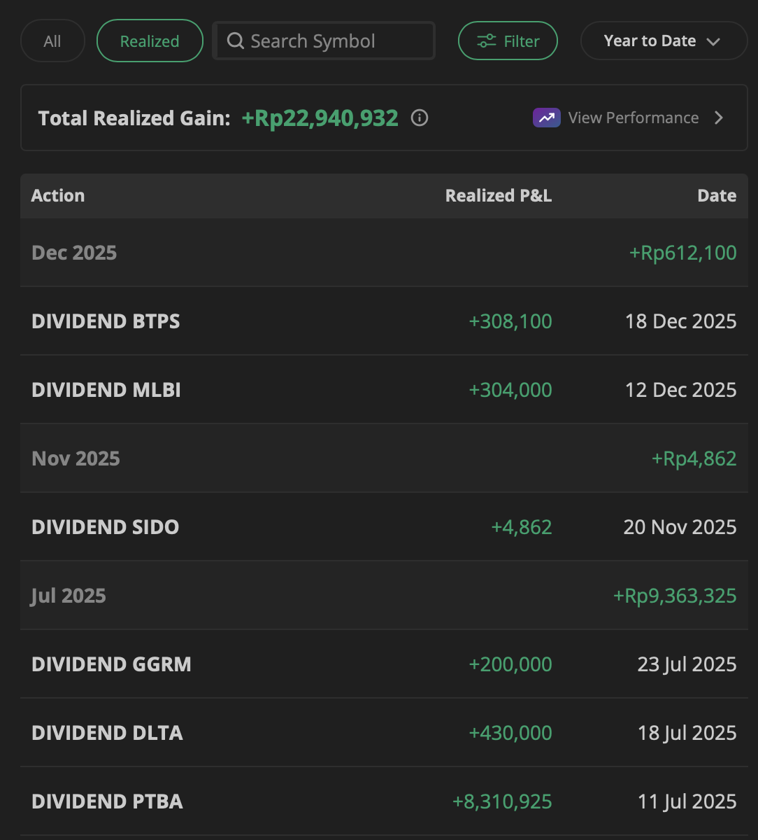 Sepanjang 2025, saya menerima dividen saham sekitar Rp22,6 juta. Naik dibanding 2024, meski belum melampaui capaian terbaik di 2023.