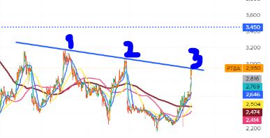 resistance atau level harga tertentu yang sangat susah ditembus, tapi pola ini terlihat akan mudah ditembus, bukan 3x , karena sebelum pola 1, terlihat akan ke resistance namun tidak kuat, 2950 adalah kuncinya untuk lanjut ke area 3450
