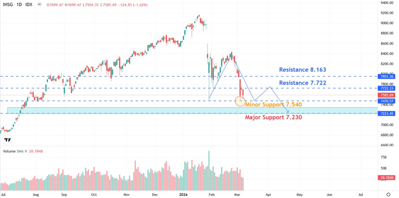 IHSG menjebol support minor di 7.540 dan berpotensi untuk uji area major support di sekitaran 7.230 mengingat massivenya katalis negatif.