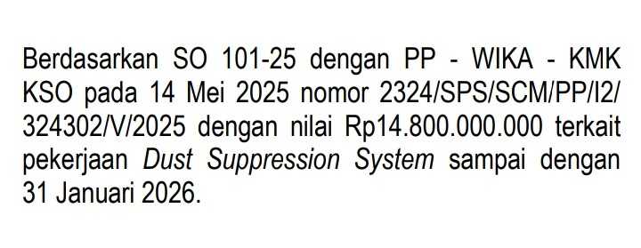 KSO PP-WIKA-KMK ini mengerjakan proyek Coal Handling Facility (CHF) dan Train Loading Station (TLS) milik $PTBA di Sumsel.