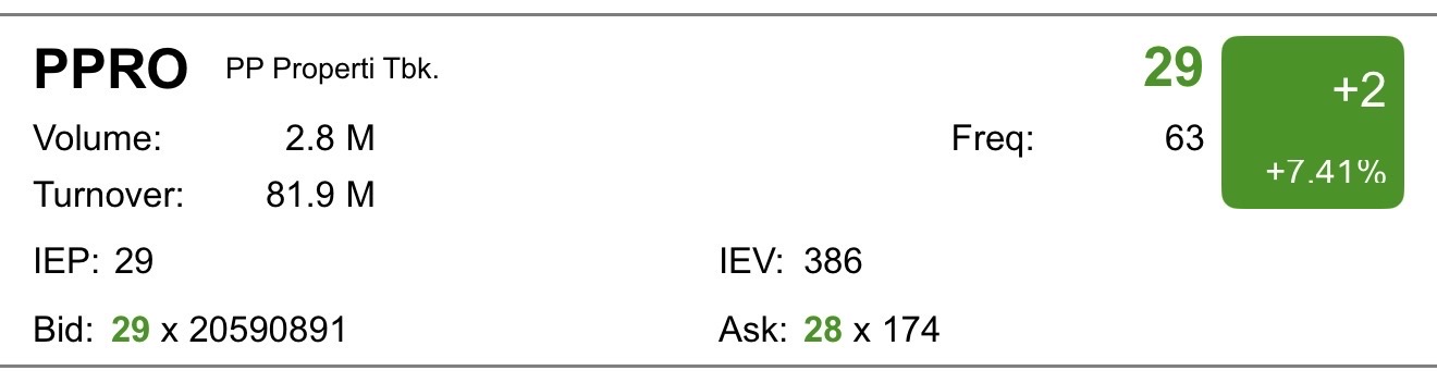 $PPRO masa kamu sendiri yg ijo, tmn2 mu $PTPP dan $PPRE merah. Btw warga ritel xl, xc, sq, pd kaga kebagian brg yak, pdhl 4jt lot hari ini transaksi nya 😆🤣