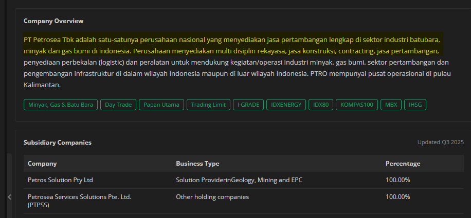PT Petrosea Tbk adalah satu-satunya perusahaan nasional yang menyediakan jasa pertambangan lengkap di sektor industri batubara, minyak dan gas bumi di indonesia. Perusahaan menyediakan multi disiplin rekayasa, jasa konstruksi, contracting, jasa pertambangan, penyediaan perbekalan (logistic) dan peralatan untuk mendukung kegiatan/operasi industri minyak, gas bumi, sektor pertambangan dan pengembangan infrastruktur di dalam wilayah Indonesia maupun di luar wilayah Indonesia. PTRO mempunyai pusat operasional di pulau Kalimantan.
