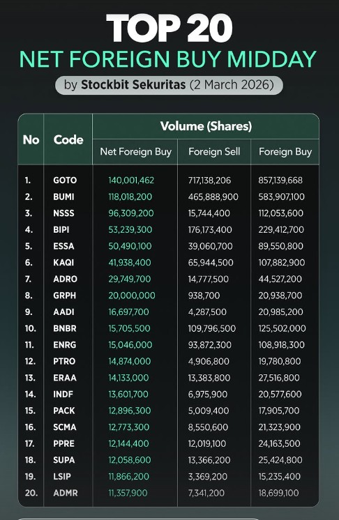 Jakarta, CNBC Indonesia — Indeks Harga Saham Gabungan (IHSG) berada di zona merah pada penutupan perdagangan sesi I Senin (2/3/2026). Meski demikian, sejumlah saham tercatat masih diborong investor asing di tengah pelemahan pasar.