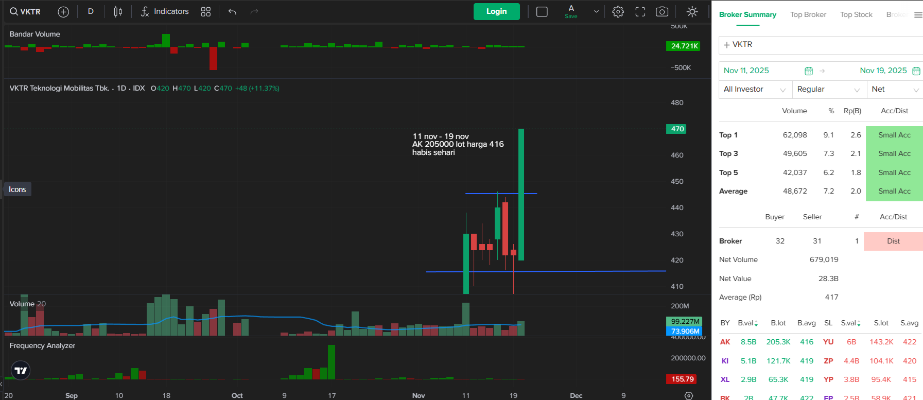 Trigger: Buy on Weakness pantulan MA/wedge, scaling in saat retracement 486–494 bertahan, trailing stop ATR bawah, scaling out jika sinyal distribusi bandarmology muncul besar.
