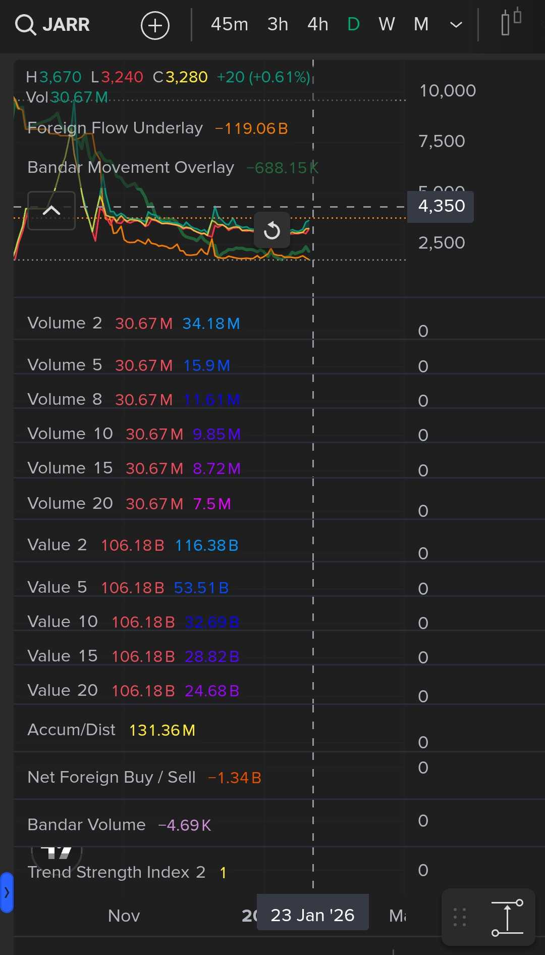 Mari Bedah Pergerakan Saham $JARR Time Frame 1 Hari dari data volume dan value transaksi periode terbaru (kiri) dikurangi periode yang lebih lama (kanan) dimana Periode terbaru menunjukkan volume 30.67 juta lembar saham, sedangkan periode lama bervariasi mulai dari 34.18M (2 hari) hingga 7.5M (periode 20 hari).