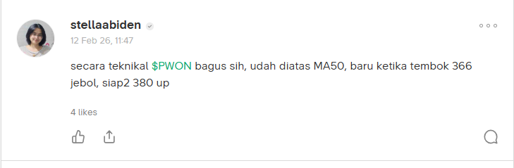 $PWON sesuai prediksi gua kemarin 366 jebol cuss 380, tapi ya palingan juga sideways dulu, santai, ngopi2 cantik dulu dulu kita distarbuck atau di $FORE