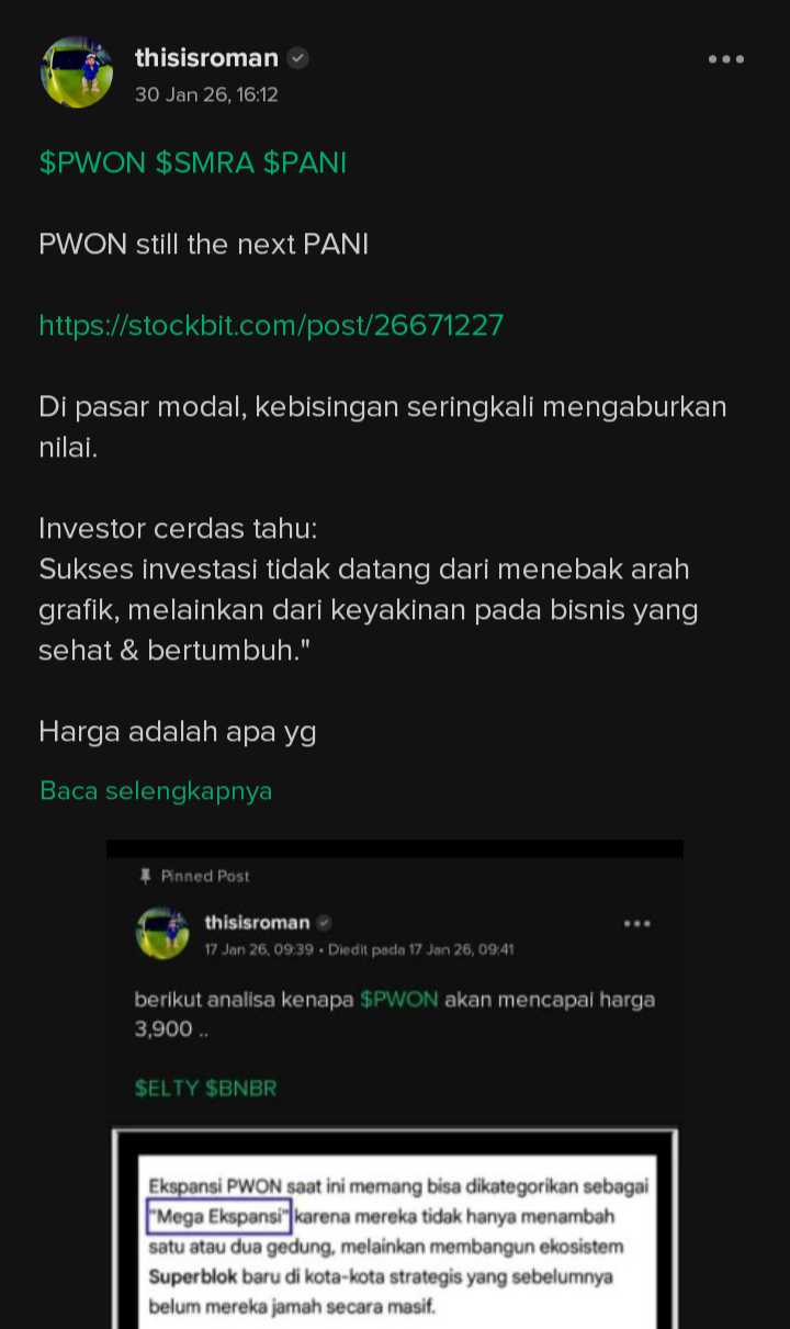 PWON punya kombinasi: fundamental kuat, recurring income tebal, pipeline proyek panjang, dan sektor mall yang sedang in-favor. Pergerakan harga lebih banyak soal timing institusi masuk/keluar dan kondisi makro (suku bunga, IHSG), bukan isu survival seperti second-tier property.