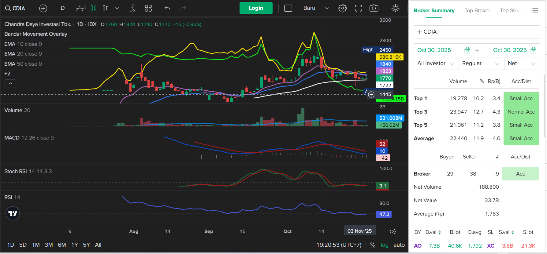 CDIA mengalami koreksi setelah mencapai puncak di harga 2,450. Saat ini, harga bergerak di sekitar level 1,770 dan masih berada di bawah EMA 10, 20, dan 50, menunjukkan potensi bearish atau konsolidasi dalam waktu dekat.