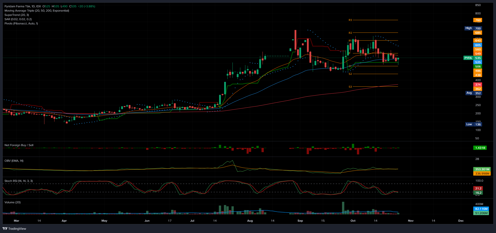 Harga ditutup di 535 (+3,88%), sempat menyentuh high 535 (+3,88%) dan low 490 (-4,85%). Saat ini harga berada di bawah MA5 (536,00), sedikit di bawah MA10 (557,00), sedikit di bawah MA20 (575,75), sedikit di bawah MA50 (546,12) dan Parabolic (603) β tren jangka menengah sideways dengan rebound ringan. Support terdekat ada di 492 (Second Support), resistance di 533 (First Resistance) lalu 552 (Second Resistance).