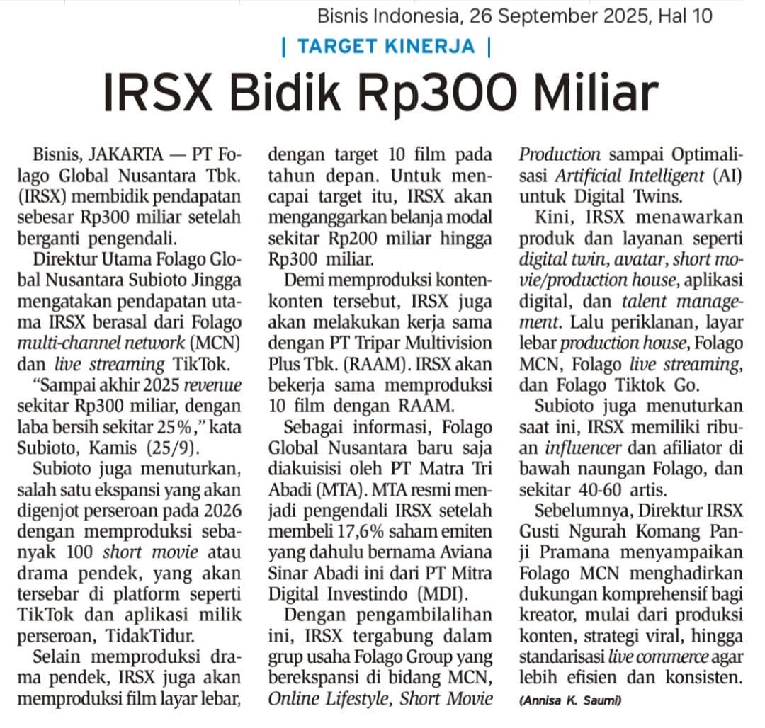 Folago (IRSX) Pacu Bisnis Film, Gandeng Multivision (RAAM)