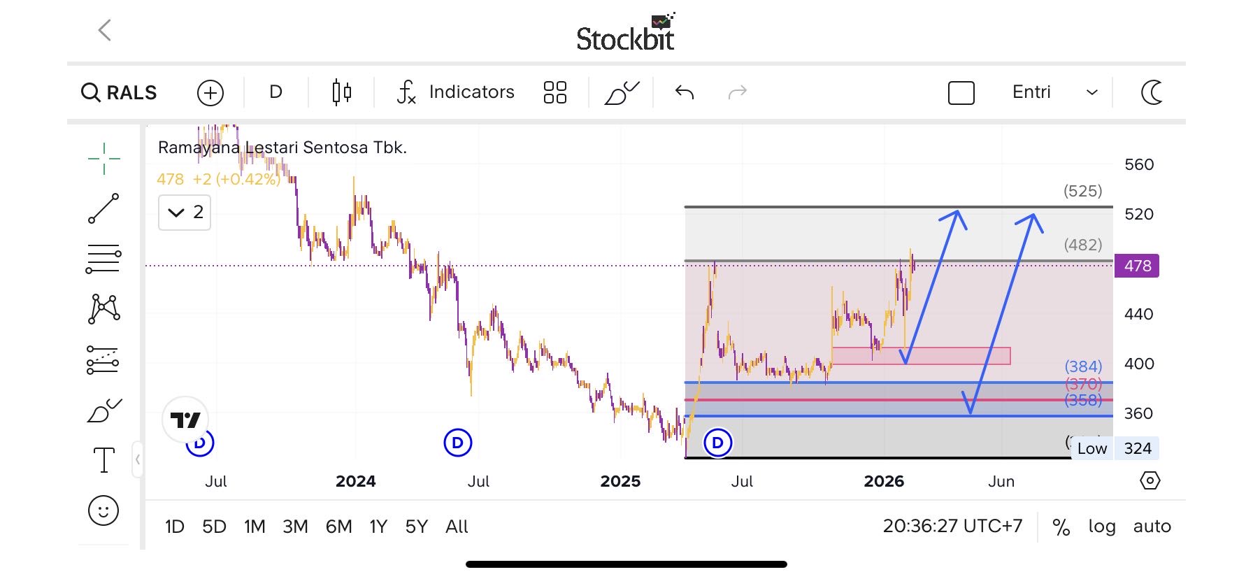 $RALS PBV under 1; harga wajar kisaran 518; sentimen mau lebaran; tinggal nunggu laporan Q4, tapi kemungkinan sih revenue growth... mayan buat tiket mudik.