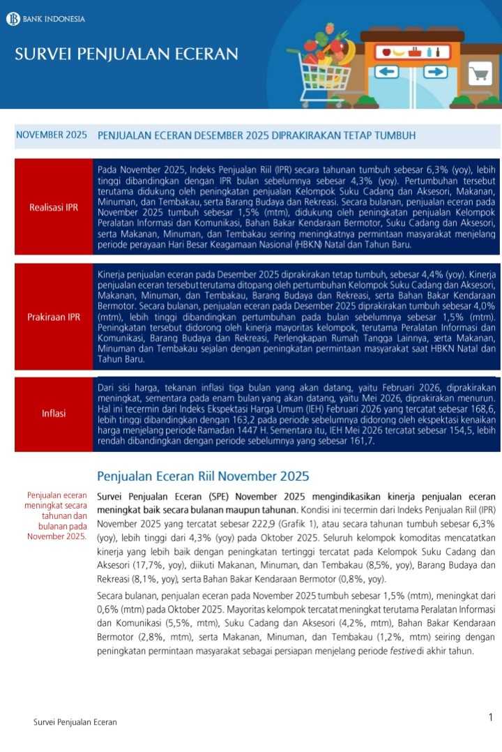 Realisasi Indeks Penjualan Riil (IPR) Nov 2025 tumbuh +1,5% mtm dan +6,3% yoy.