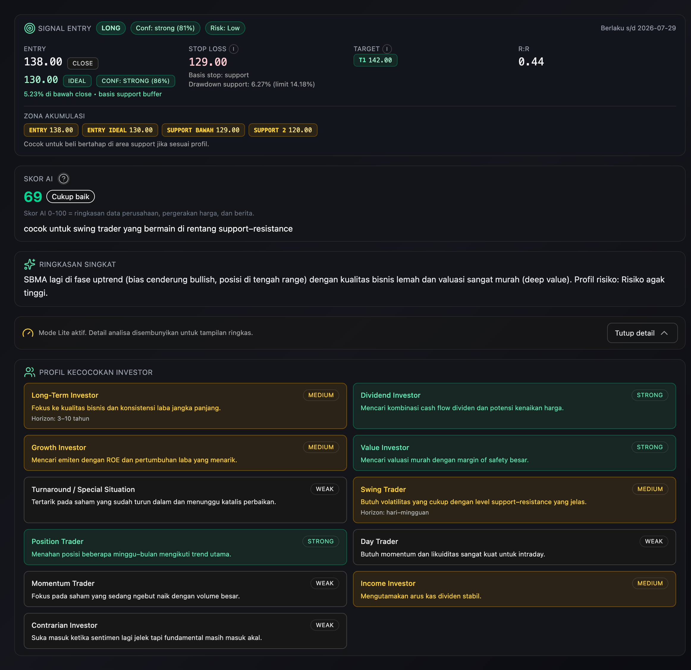 - Cocok untuk swing / rebound, belum ideal untuk mid-term agresif
